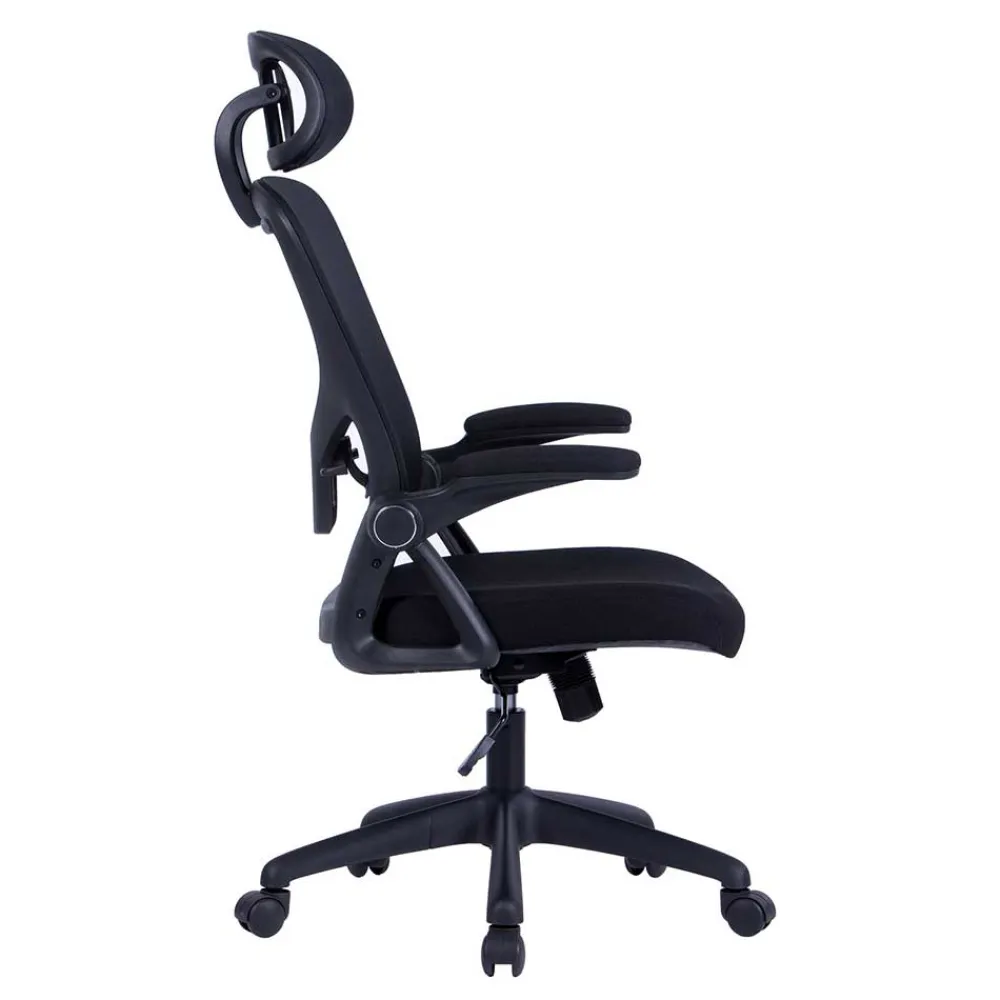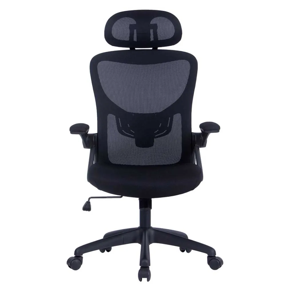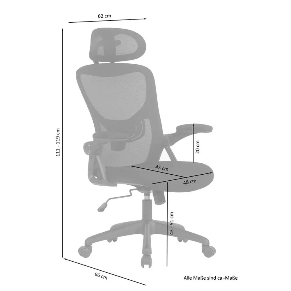 Die stufenlos verstellbare Sitzhöhe von 43-51 cm ermöglicht eine ergonomische Anpassung an Ihren Arbeitsplatz. Die hochklappbaren Armlehnen mit einer Höhe von 20 cm bieten Flexibilität, während die Lordoseunterstützung und die neigbare Kopfstütze für optimale Unterstützung sorgen. Die Wippmechanik mit Härtegradeinstellung erlaubt eine individuelle Anpassung des Stuhls an Ihre Bedürfnisse.