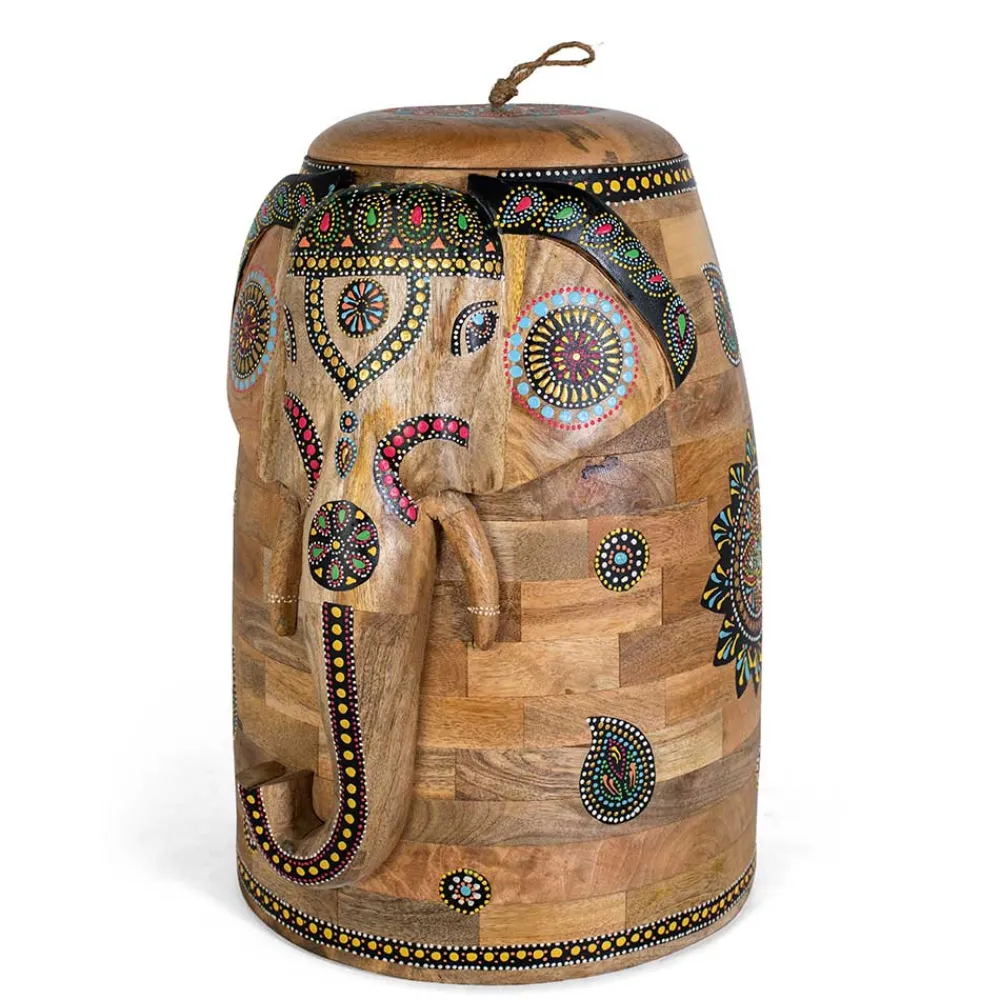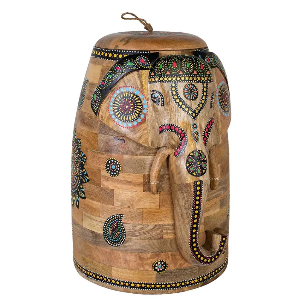 Der abnehmbare Deckel der Truhe ist mit einer praktischen Schlaufe versehen, die für zusätzlichen Komfort beim Öffnen sorgt. Im Inneren bietet die Truhe ausreichend Platz für Ihre Habseligkeiten und überzeugt nicht nur als dekoratives Element, sondern auch als praktische Aufbewahrungslösung. Die plastische Gestaltung des Elefanten sowie die kunstvollen, bunten Ornamente machen sie zu einem besonderen Möbelstück, das sowohl funktional als auch ästhetisch begeistert.