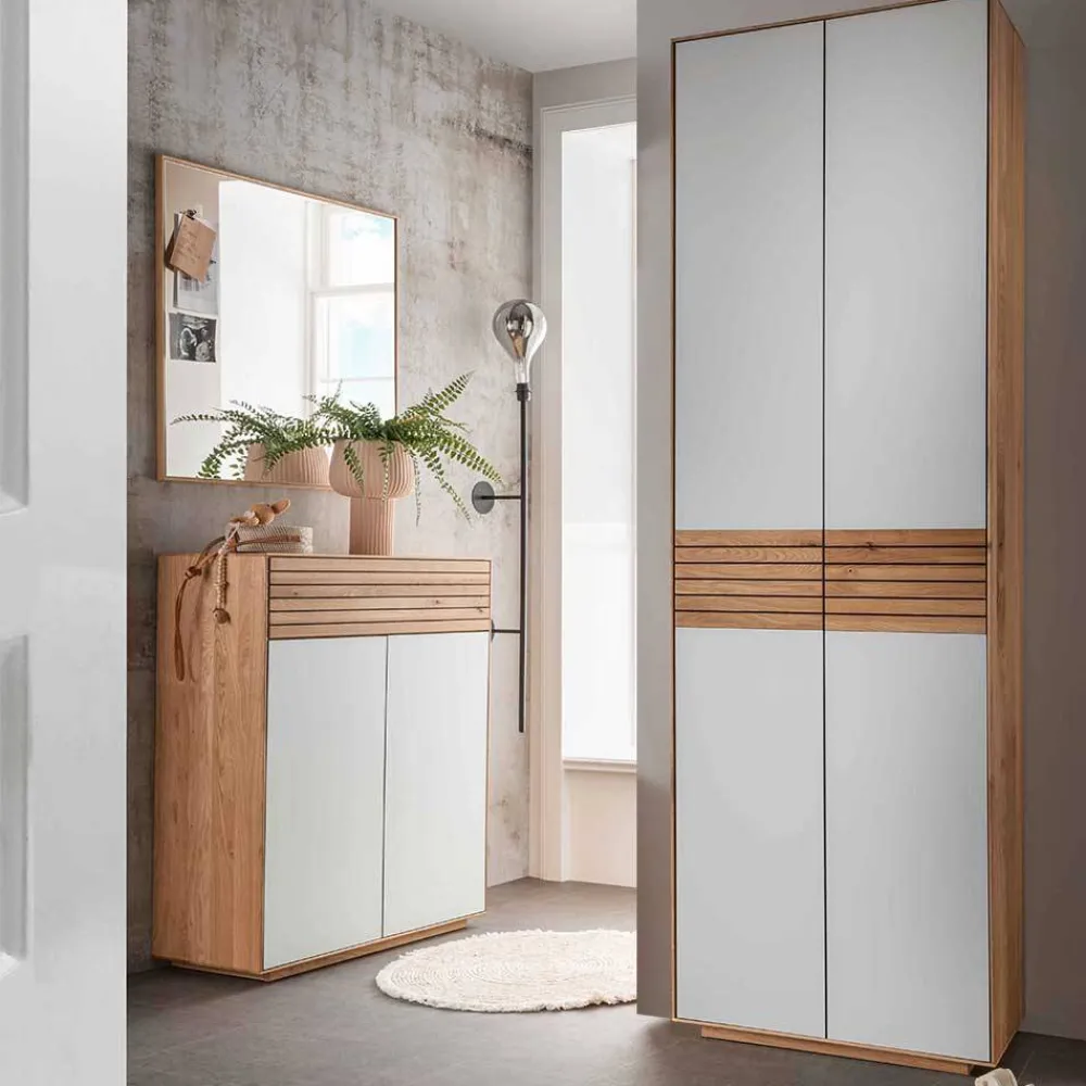 Das Dielenmöbel-Set „Zonga“ steht für hochwertige Verarbeitung und zeitloses Design – gefertigt in Deutschland mit erstklassigen Materialien und innovativer Funktionalität. Die Kombination aus massiver Asteiche und weißen Satinglas-Fronten vereint Natürlichkeit mit moderner Eleganz und sorgt für einen perfekt organisierten Eingangsbereich.