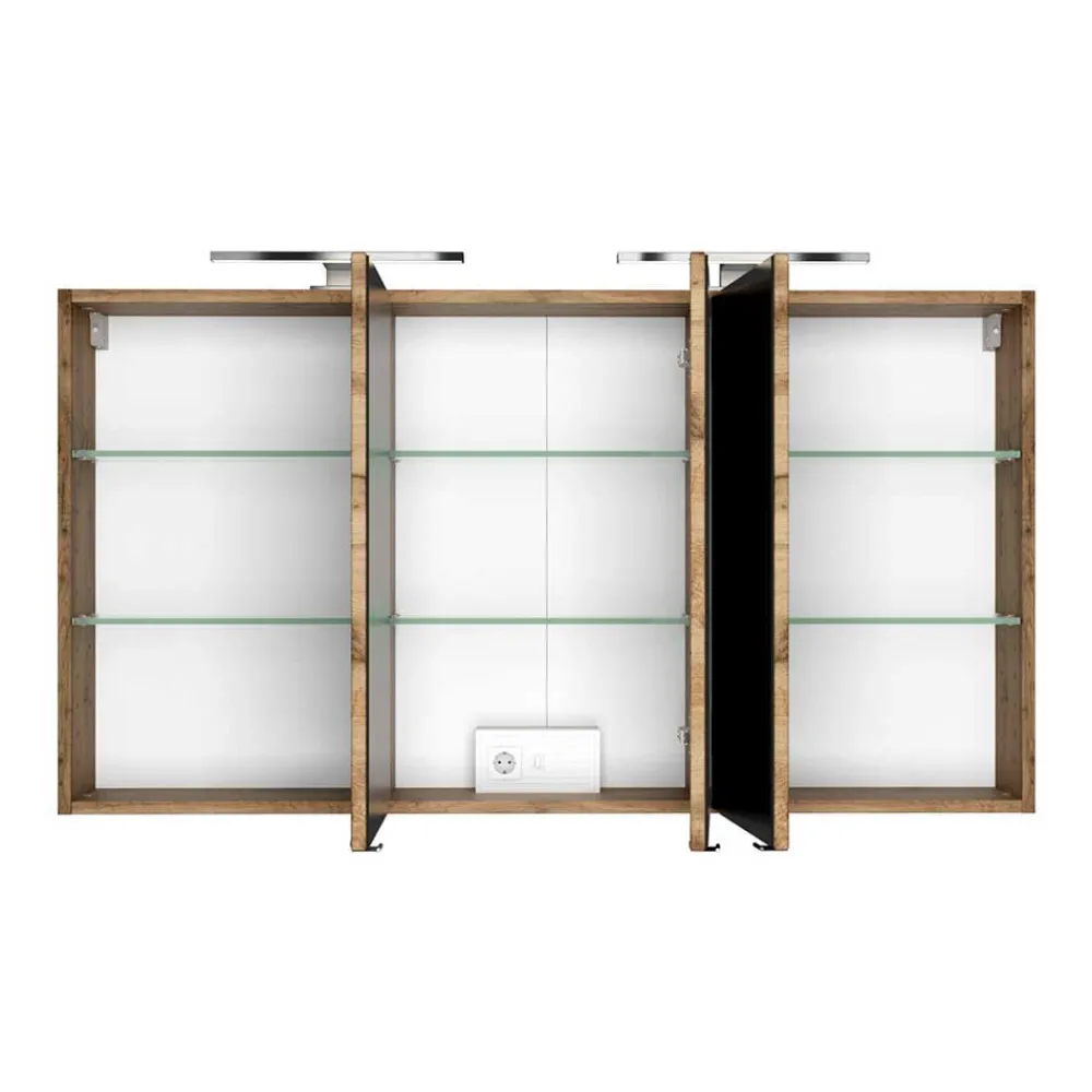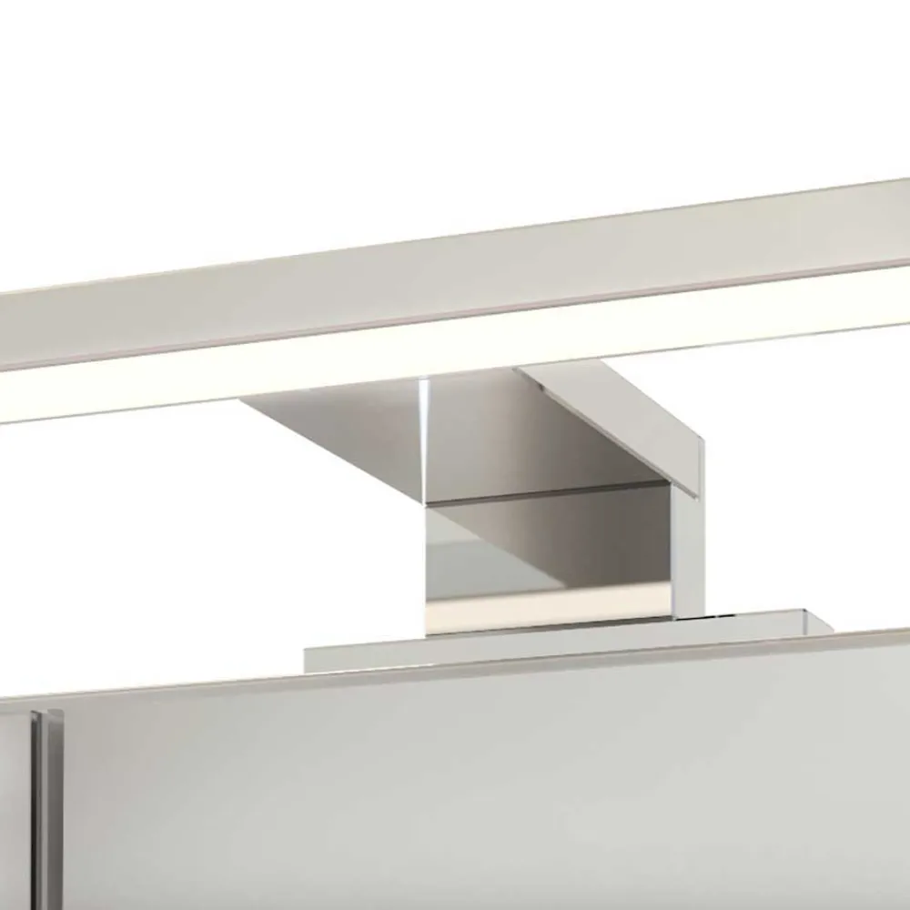 Der großzügig bemessene Spiegelschrank verfügt über drei Türen mit langlebigen Metallbeschlägen und edlen Minimalgriffen. Die großflächige Verspiegelung bietet nicht nur eine bequeme Möglichkeit zur Morgenroutine, sondern lässt den Raum optisch größer wirken. Im Inneren des Schrankes erwarten Sie je zwei verstellbare Glasböden pro Fach, die individuell anpassbaren Stauraum für Ihre Pflegeprodukte bieten. Die mittig platzierte Trafobox ist mit einem Schalter und einer Steckdose ausgestattet, perfekt zum Anschließen von elektrischen Geräten wie Föhn oder Rasierer. Für optimale Lichtverhältnisse sorgt die effiziente LED-Aufbauleuchte, die eine angenehme, blendfreie Beleuchtung schafft – ideal für präzises Schminken und Rasieren.