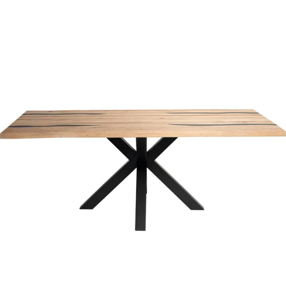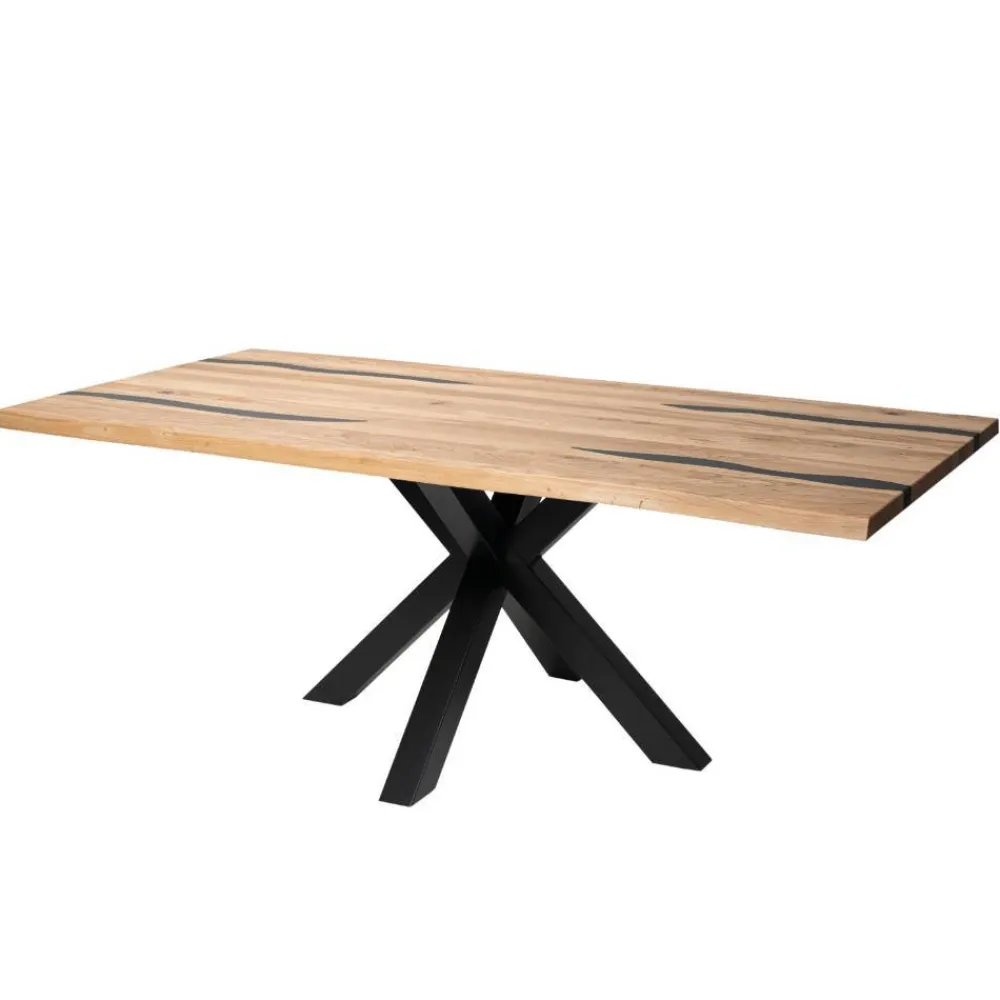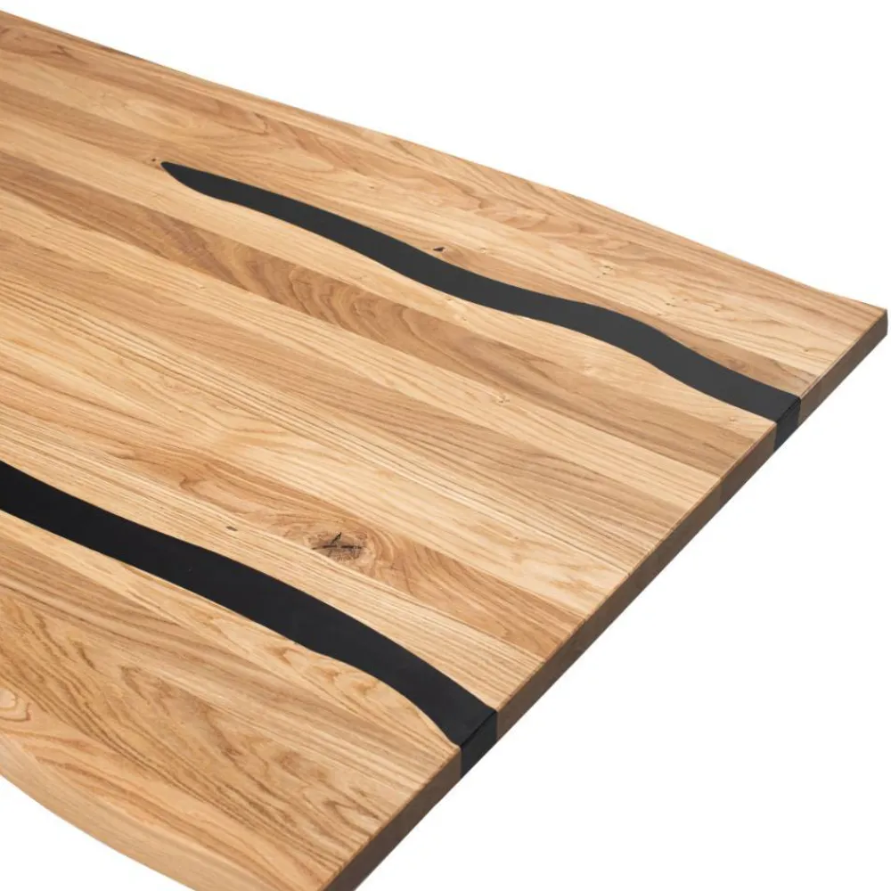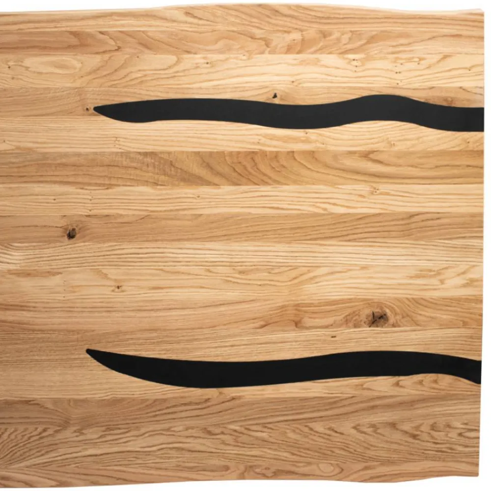 Die Tischplatte des Eiche Esszimmertischs „Slavidra“ ist 2 cm stark und auf 4 cm aufgedoppelt, was ihr Stabilität und eine hochwertige, wertige Optik verleiht. Die durchgehende Lamellenverarbeitung, die rustikal lackierte Oberfläche und die mit Kitt gespachtelten Stellen unterstreichen den natürlichen Charakter des Holzes und machen die Platte zu einem Unikat. Die langen Seiten sind mit natürlichen, unterschiedlich gewellten Baumkanten versehen, die den Tisch lebendig und unverwechselbar wirken lassen. Besonders eindrucksvoll sind die vier Epoxid-Harz-Flammen-Einlagen, jeweils zwei an jedem kurzen Ende, die kunstvoll in die Holzplatte eingearbeitet sind. Sie erzeugen raffinierte Lichteffekte und setzen den Tisch gekonnt in Szene.