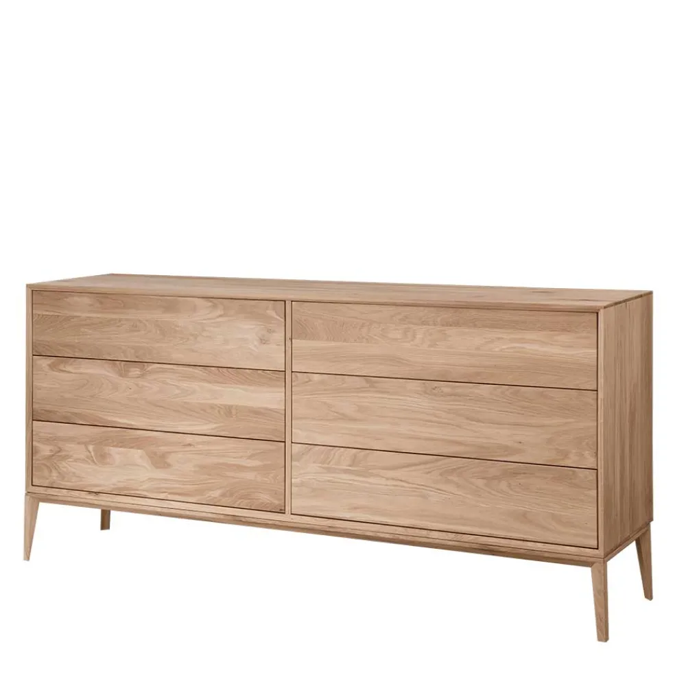 Wildeiche, bekannt für ihre Robustheit und Langlebigkeit, ist das Herzstück dieser Kommode. Das massive Holz zeigt eine lebendige Maserung und strahlt Wärme aus, die jedes Ambiente bereichert. Die Oberflächen der massiven Wildeiche sind in hellem Bianco geölt. Diese spezielle Behandlung schützt das Holz nicht nur, sondern unterstreicht auch seine hochwertige Erscheinung.