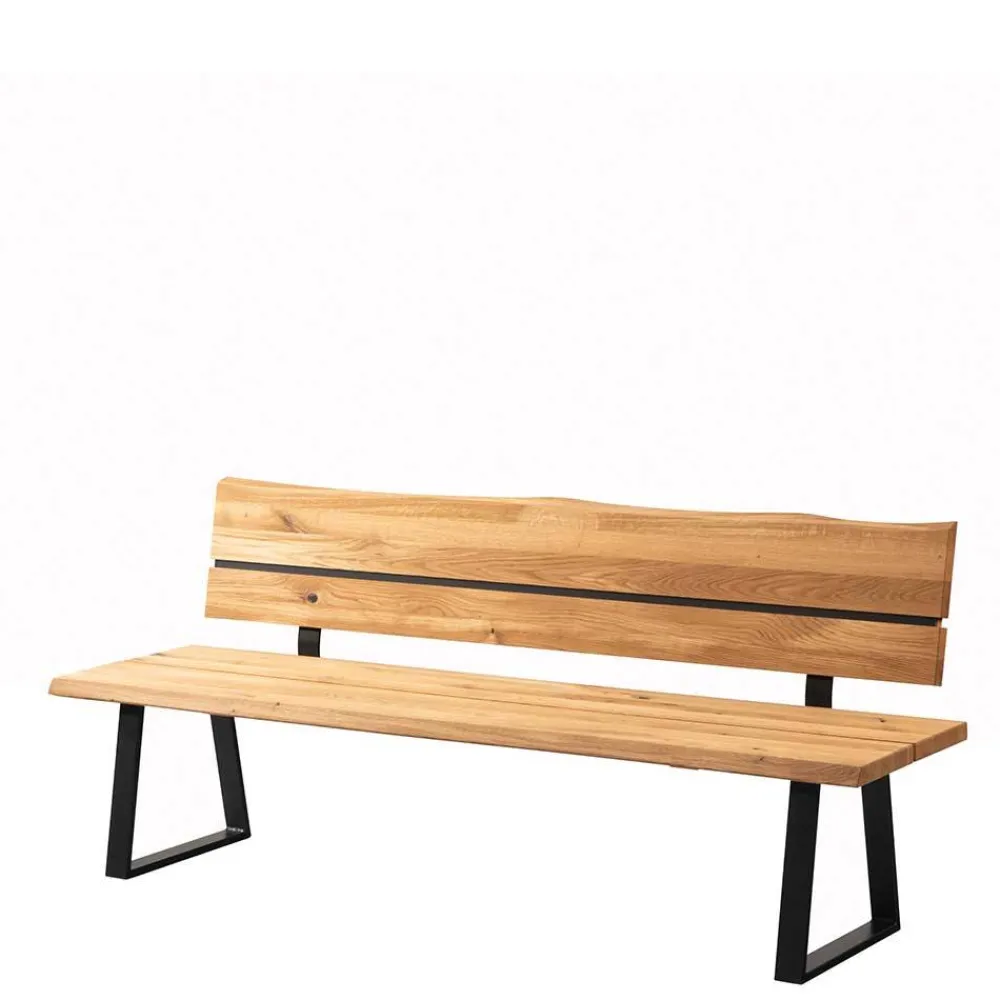 Die Essbank „Jessmine“ besticht durch ihre sorgfältige Verarbeitung. Der Bezug besteht aus geöltem Wildeiche Massivholz, das in seiner natürlichen Schönheit strahlt. Die Holzoberfläche zeigt dabei die einzigartige Baumkante, was jedes Stück zum Unikat macht. Abgerundet wird das Design durch die Rückenlehne mit organisch geformtem Abschluss, die mit einem eleganten schwarzen Hochdrucklaminat versehen ist. Das standfeste Metallbügelgestell in trapezförmiger Ausführung sorgt für die nötige Stabilität, während die Pulverbeschichtung in Schwarz das moderne Industrie- und Loft-Feeling unterstreicht.