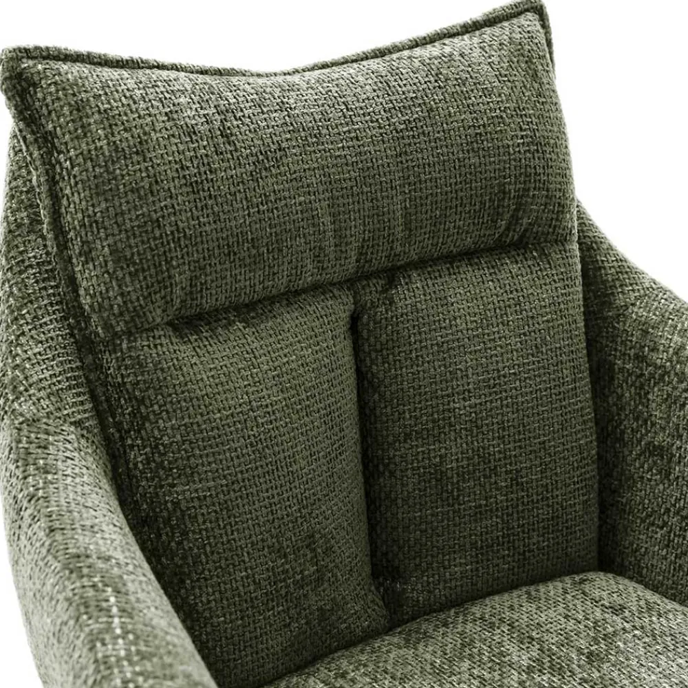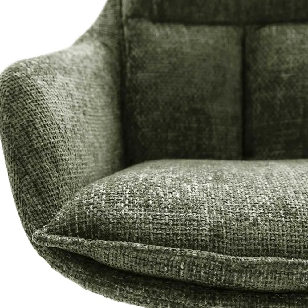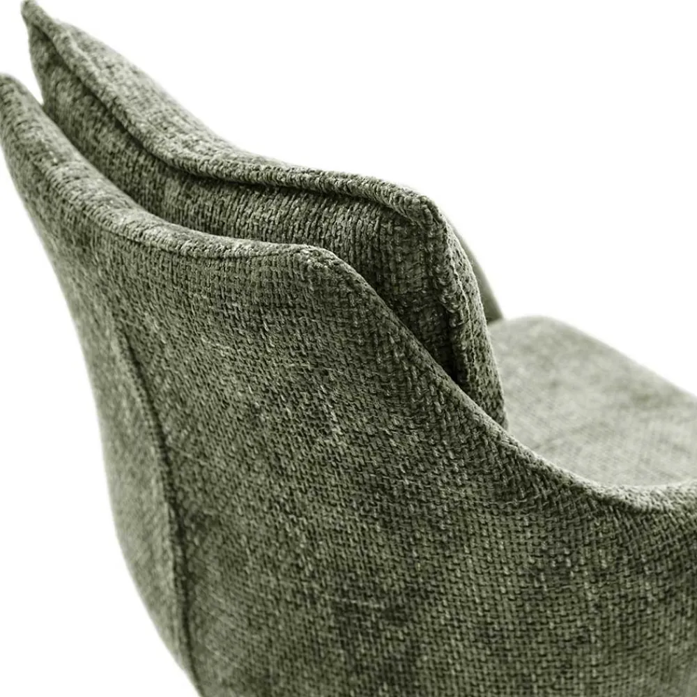 Der oliv-grüne Strukturstoff aus 100 % Polyester fühlt sich nicht nur besonders weich an, sondern ist auch äußerst pflegeleicht. Der Bezug ist strapazierfähig und behält seine ansprechende Optik auch nach langer Nutzung. Gleichzeitig verleiht der umlaufende Keder um die Sitz- und Rückenfläche dem Stuhl zusätzliche Eleganz und schützt die Kanten vor Abnutzung.
