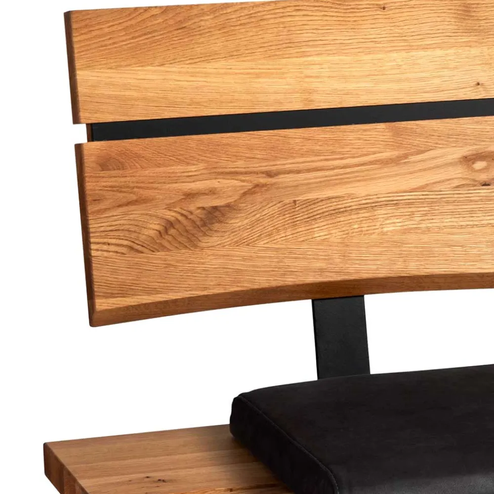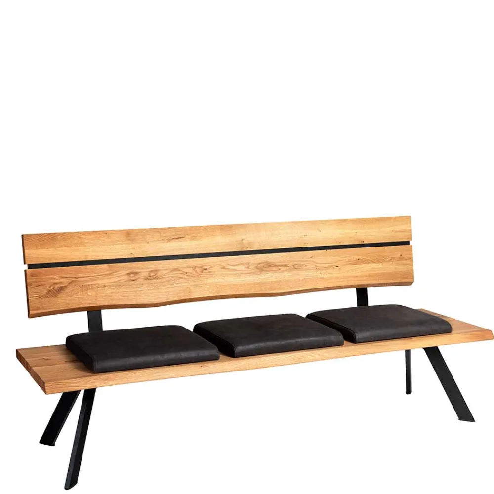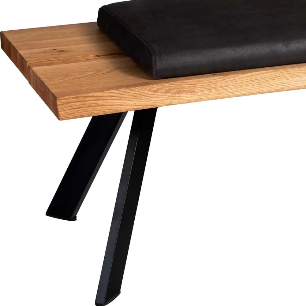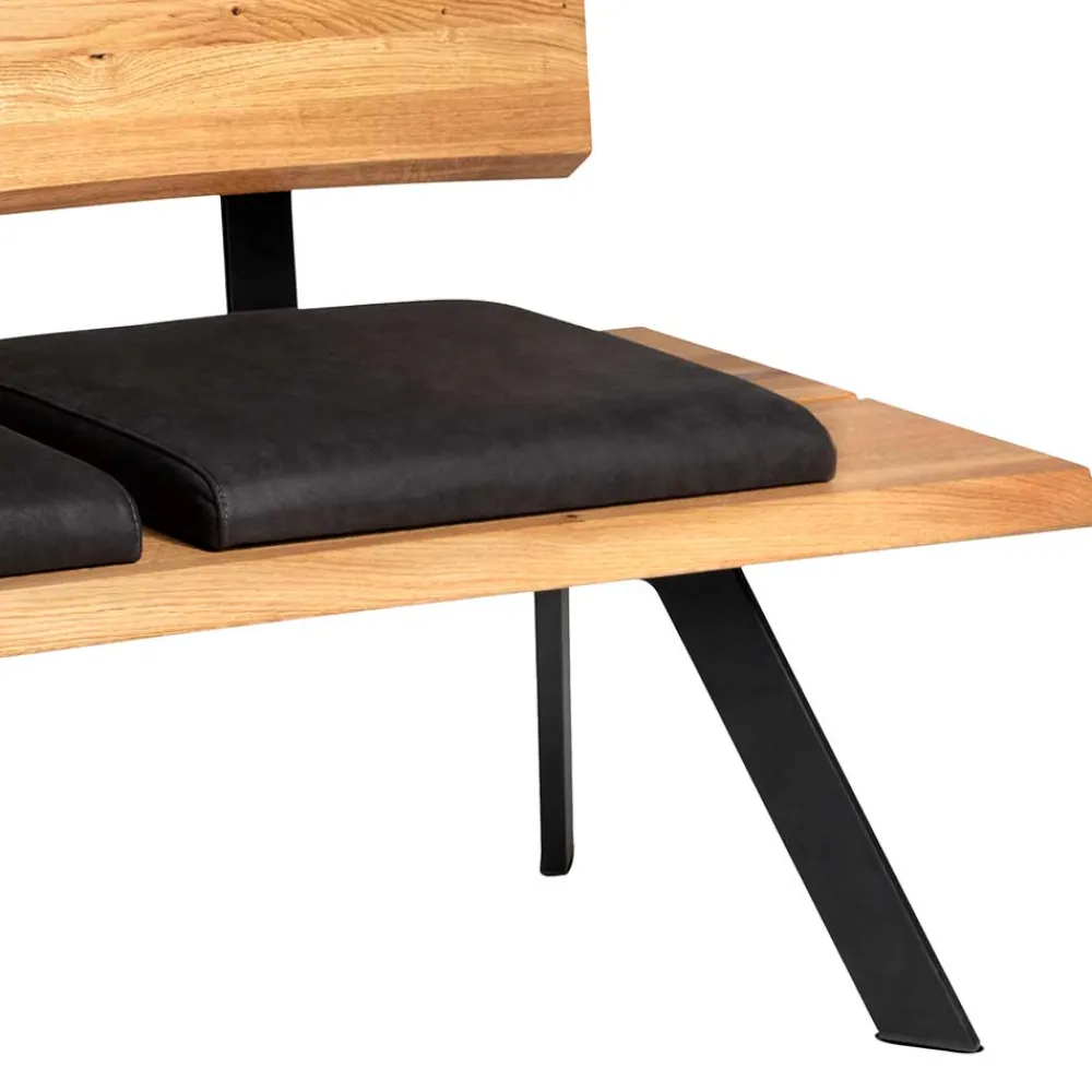 Gefertigt aus massivem Wildeichenholz, strahlt die Bank „Piton“ eine natürliche Wärme und Beständigkeit aus. Die geölte Oberfläche des Holzes betont die einzigartige Maserung und schützt gleichzeitig vor alltäglichen Beanspruchungen. Für zusätzlichen Sitzkomfort sorgen die drei verschiebbaren Sitzpolster, die mit hochwertigem schwarzem Echtleder bezogen sind. Unter den Polstern befindet sich eine komfortable Schaumstoffpolsterung, die für angenehmen Sitzkomfort sorgt. Die pulverbeschichteten Metallbeine in schräger Konstruktion gewährleisten eine stabile und sichere Standfestigkeit, selbst bei intensiver Nutzung. Ein weiteres Highlight ist die leicht geneigte Rückenlehne aus Massivholz, die mit einem schwarzen Hochdrucklaminat-Einsatz veredelt wurde – so ist nicht nur die Optik, sondern auch die Anlehnung optimal.