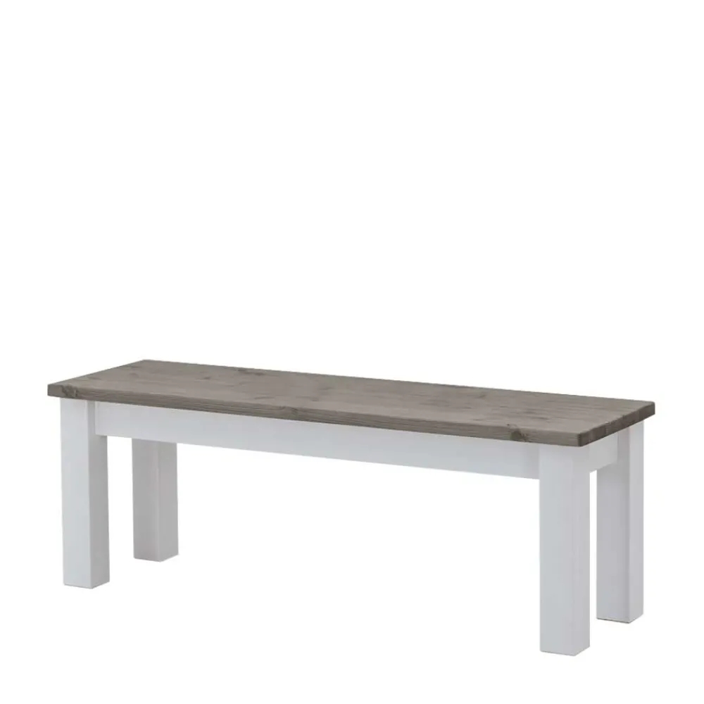 Hergestellt aus massiver nordischer Kiefer, strahlt unsere Sitzbank natürliche Schönheit und Robustheit aus. Die Wahl von Kiefernholz als Hauptmaterial bringt zahlreiche Vorteile mit sich. Das Holz ist nicht nur äußerst stabil und langlebig, sondern auch leicht zu pflegen. Durch die weiße Lackierung der Oberflächen und die grau lackierte Sitzfläche entsteht eine zweifarbige Optik, die Ihrem Wohnraum eine besondere Note verleiht. Die durchscheinende Maserung des Kiefernholzes bleibt dabei dezent sichtbar und verleiht der Bank einen einzigartigen Charme.