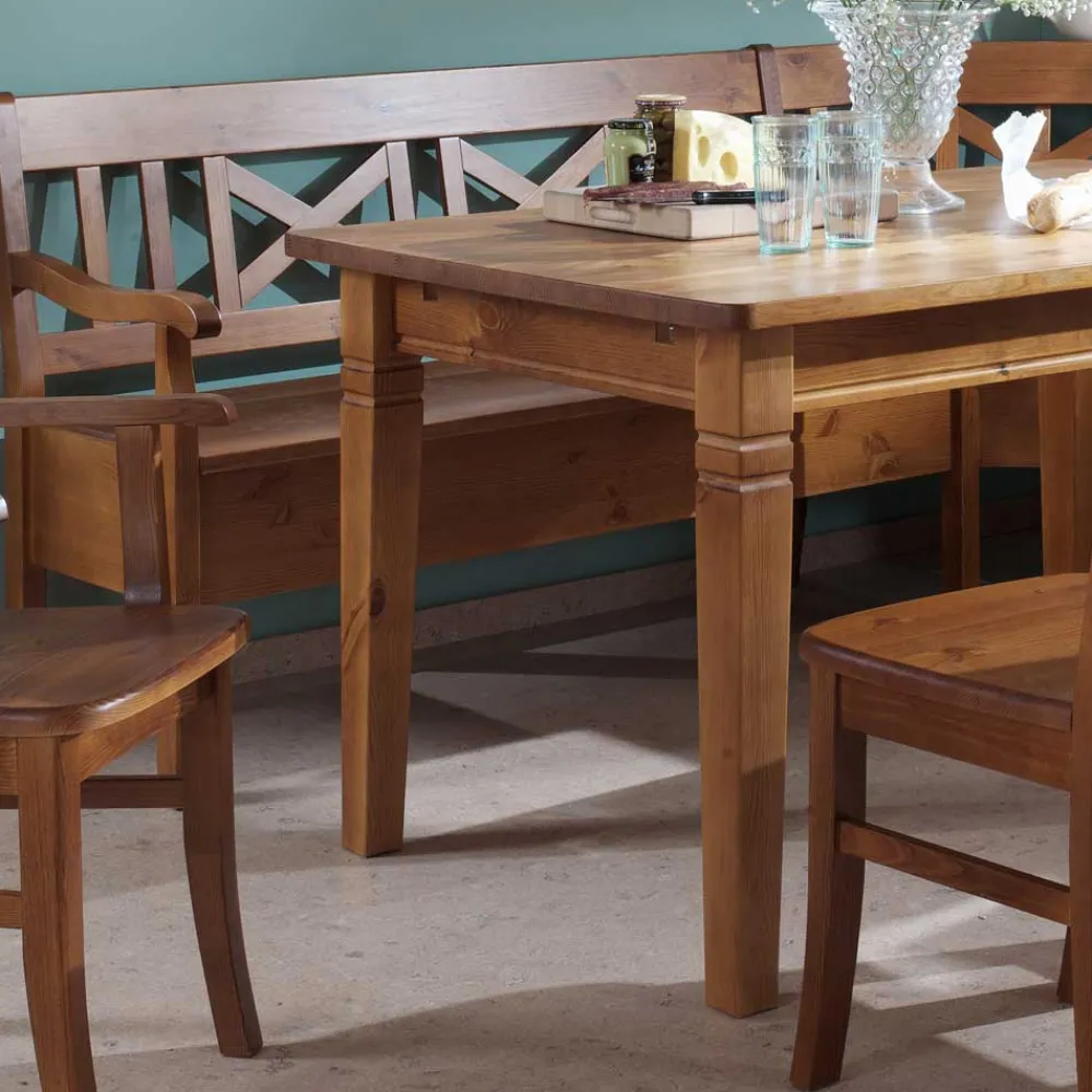 Entdecken Sie mit der Eckbankgruppe „Bistrita“ ein Highlight für Ihr Esszimmer, das sowohl durch sein Design als auch durch seine Funktionalität besticht. Diese Gruppe, bestehend aus einem Tisch, einer Eckbank und drei robusten Massivholzstühlen, verkörpert den charmanten Landhausstil in Vollendung.