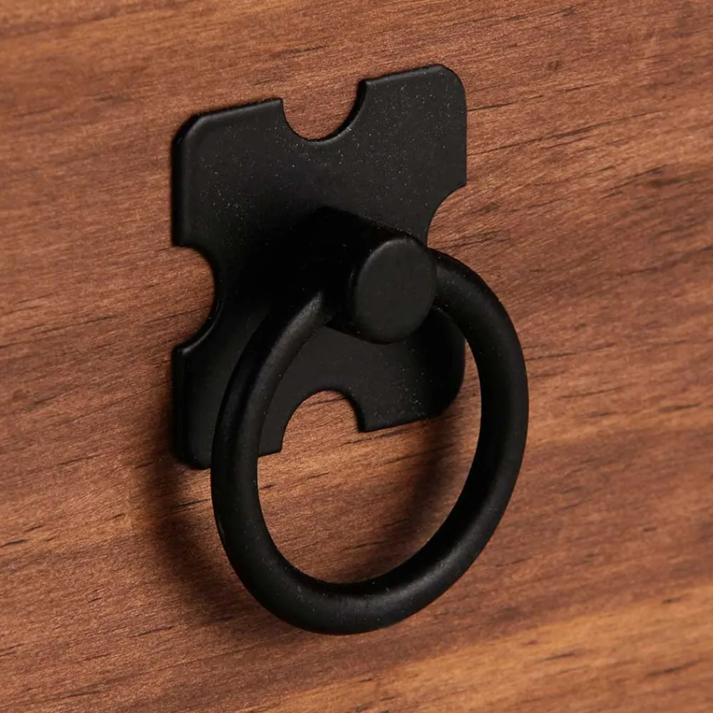 - Schwarz lackierte Ringgriffe und Ziernieten aus Metall