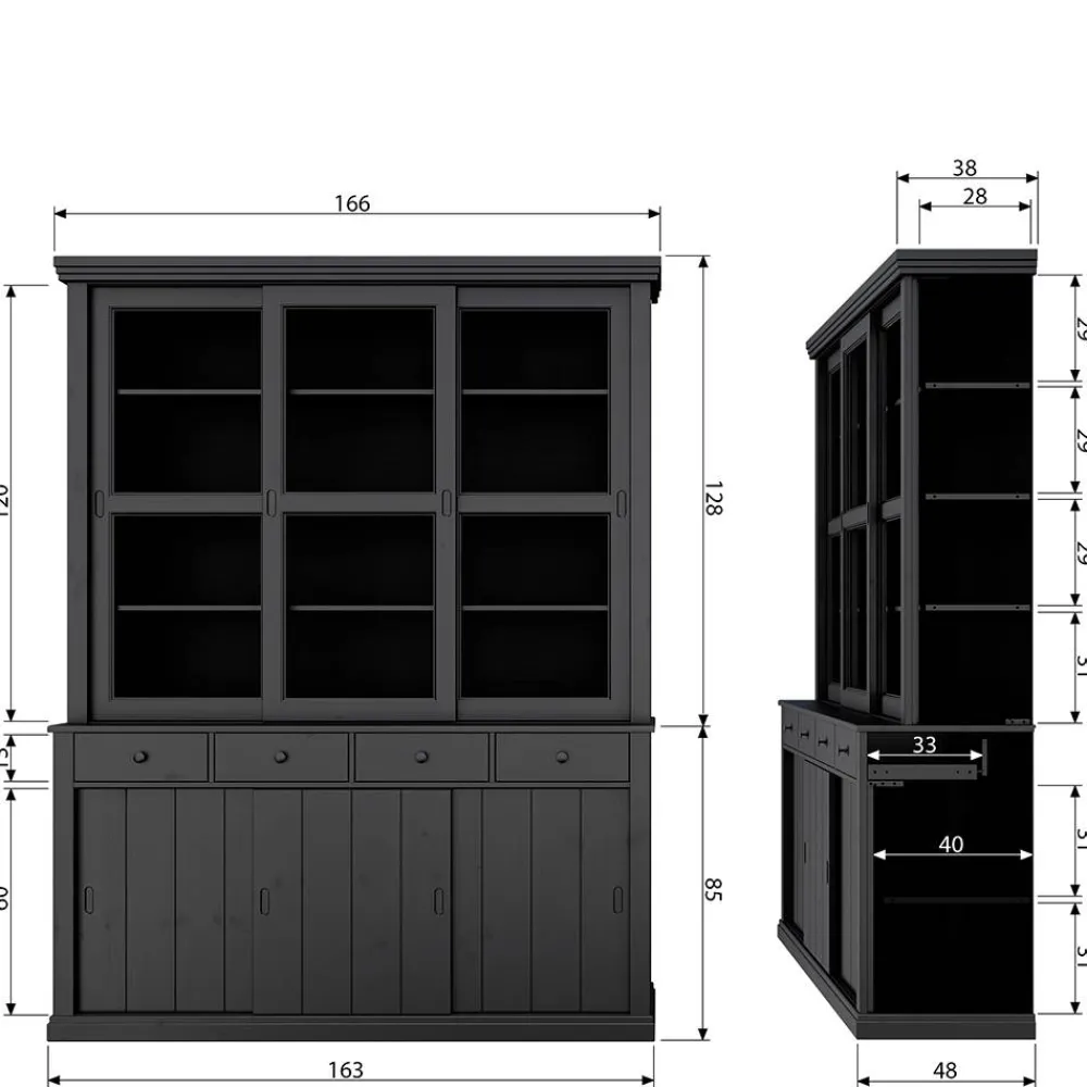 Mit einer Breite von 166 cm, einer Höhe von 215 cm und einer Tiefe von 48 cm bietet „Nariosca“ beeindruckend viel Platz – ideal, um Geschirr, Gläser, Tischwäsche oder auch Ihre schönsten Deko-Elemente stilvoll zu verstauen oder zu präsentieren. Die vier großzügigen Schubladen mit hochwertigen Metallauszügen gleiten sanft und leise – funktional und langlebig. Drei Glas- und drei Holzschiebetüren mit eleganten Zierfräsungen auf leichtgängigen Kunststoffschienen ermöglichen Ihnen schnellen Zugriff auf Ihre Lieblingsstücke, ohne den Raum zu überladen.
