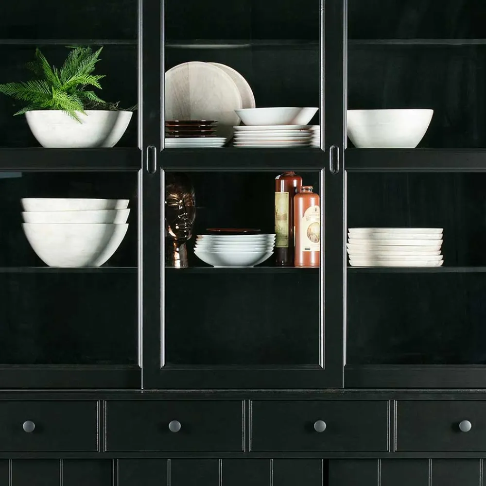 Die in Schwarz lackierten Oberflächen setzen stilvolle Akzente und verleihen dem Schrank eine moderne Tiefe, ohne seine ländliche Herkunft zu verleugnen. Der Lack schützt das Holz, betont zugleich seine Maserung und sorgt für eine leicht zu reinigende, widerstandsfähige Oberfläche – perfekt für den Alltag. Diese Kombination aus kraftvollem Farbton und natürlichen Materialien macht „Nariosca“ zu einem echten Blickfang in jedem Wohn- oder Esszimmer.