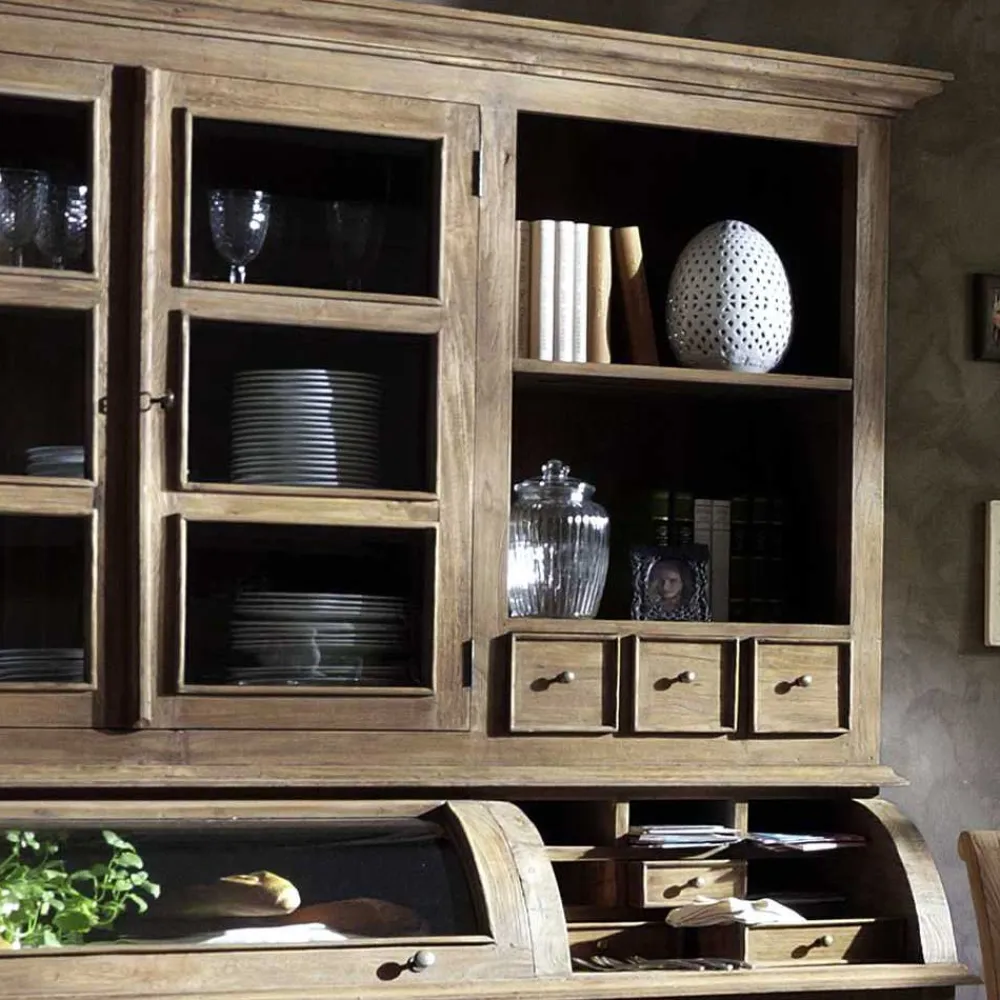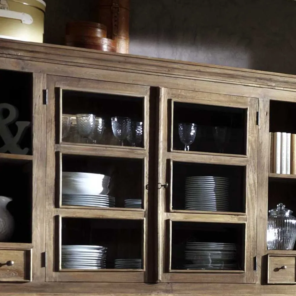 Massives Teak Recyclingholz, aus dem dieses Buffet gefertigt wird, ist für seine außergewöhnliche Langlebigkeit und Widerstandsfähigkeit bekannt. Die Verwendung von Recyclingholz verleiht jedem Stück eine individuelle Note, da jede Maserung und Farbe einzigartig ist. Dieses Holz zeigt eine natürliche Schönheit, die sich durch jede einzelne Rille und Farbe ausdrückt. Kombiniert mit hochwertigem Glas entsteht eine stilvolle Kontrastsituation, die sowohl elegant als auch funktional ist. Die Glaselemente erlauben es Ihnen, Ihre wertvollen Schätze oder dekorativen Accessoires eindrucksvoll zu präsentieren und gleichzeitig vor Staub zu schützen.