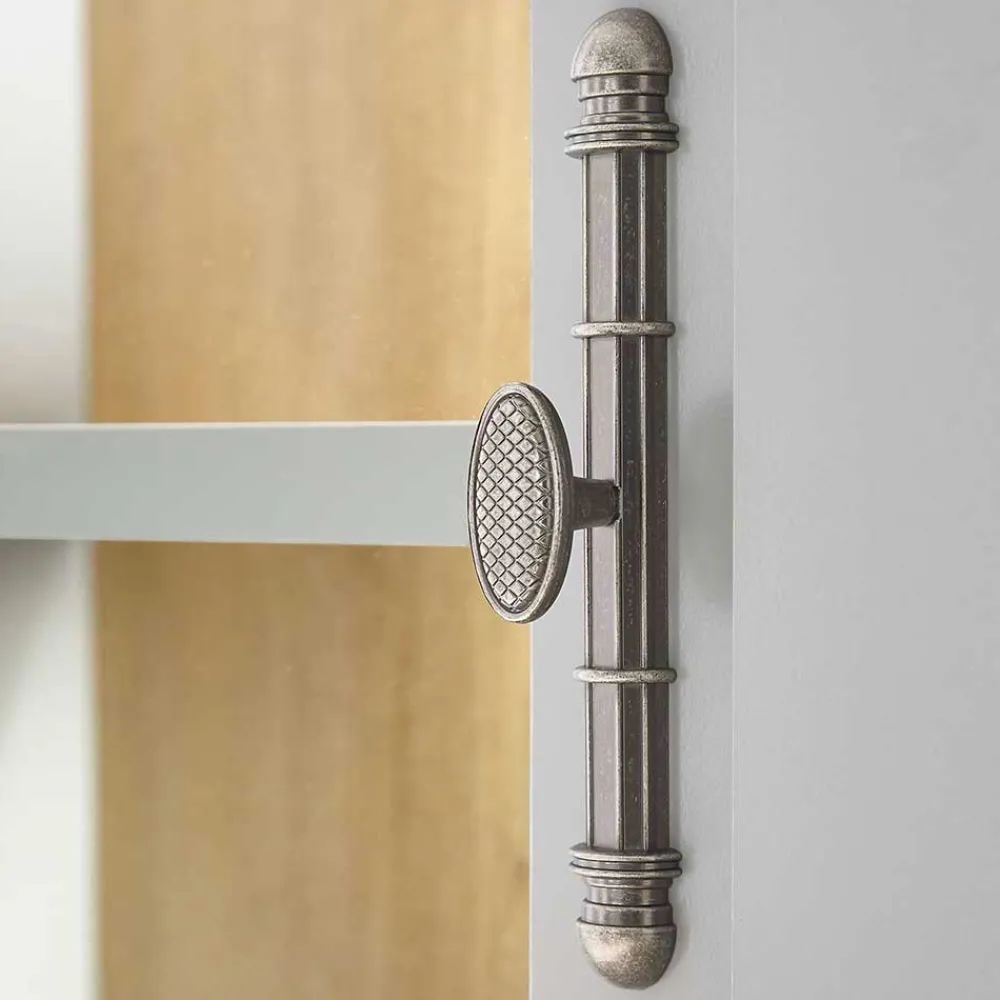 Im Mittelteil des Schranks befinden sich drei offene Fächer, ideal zur Präsentation von Büchern, Fotos oder Dekorationsartikeln, die das persönliche Ambiente Ihres Raumes unterstreichen. Darunter befindliche spezialisierte Fächer bieten sich perfekt zur Lagerung von Flaschen an, und die zwei darunterliegenden Schubladen, ausgestattet mit sanft gleitenden Metallauszügen und stilvollen Knopfgriffen in Altsilber, bieten zusätzlichen Stauraum für diverse Kleinigkeiten.