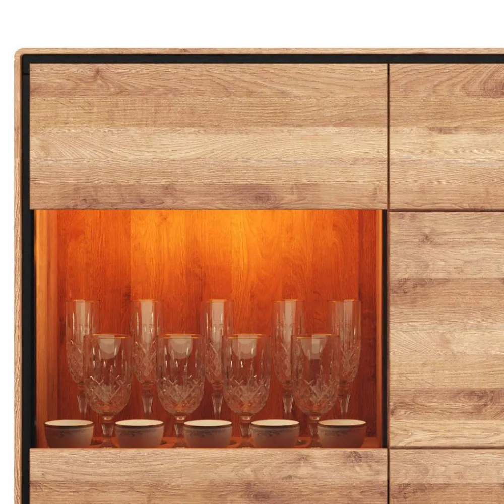 Hinter den zwei Drehtüren mit hochwertiger Soft-Close-Funktion verbirgt sich ein großzügiges Stauraumkonzept mit insgesamt fünf Holzböden – perfekt, um Geschirr, Gläser, Bücher oder persönliche Lieblingsstücke übersichtlich zu verstauen. Die linke Tür ist mit einem stilvollen Rauchglas-Einsatz versehen, der in Kombination mit optional erhältlicher LED-Beleuchtung stimmungsvolle Lichtakzente setzt und das Innenleben elegant in Szene setzt. Die unauffälligen Griffmulden ermöglichen ein komfortables Öffnen und unterstreichen zugleich die cleane, moderne Linienführung des Highboards.