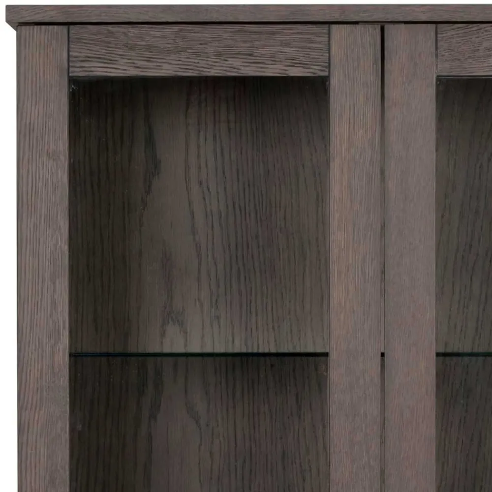 Die dunkle Eichenholzoptik dieses Vitrinenschranks setzt einen warmen und dennoch modernen Akzent in Ihrem Wohnraum. Die Kombination aus MDF (Mitteldichte Holzfaserplatte) und massivem Eichenholz garantiert Stabilität und Langlebigkeit. MDF bietet hervorragende Verarbeitungsmöglichkeiten und ist besonders formstabil, während das Massivholz für seine Robustheit und natürliche Schönheit geschätzt wird.