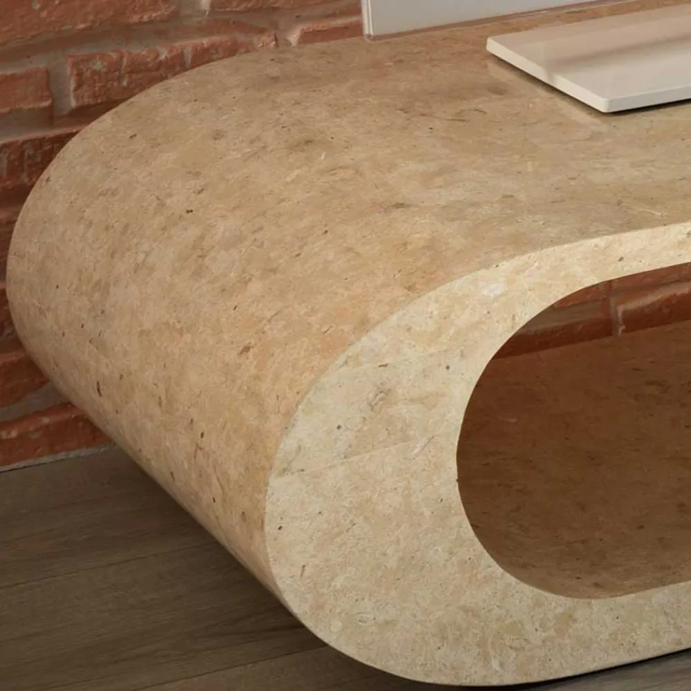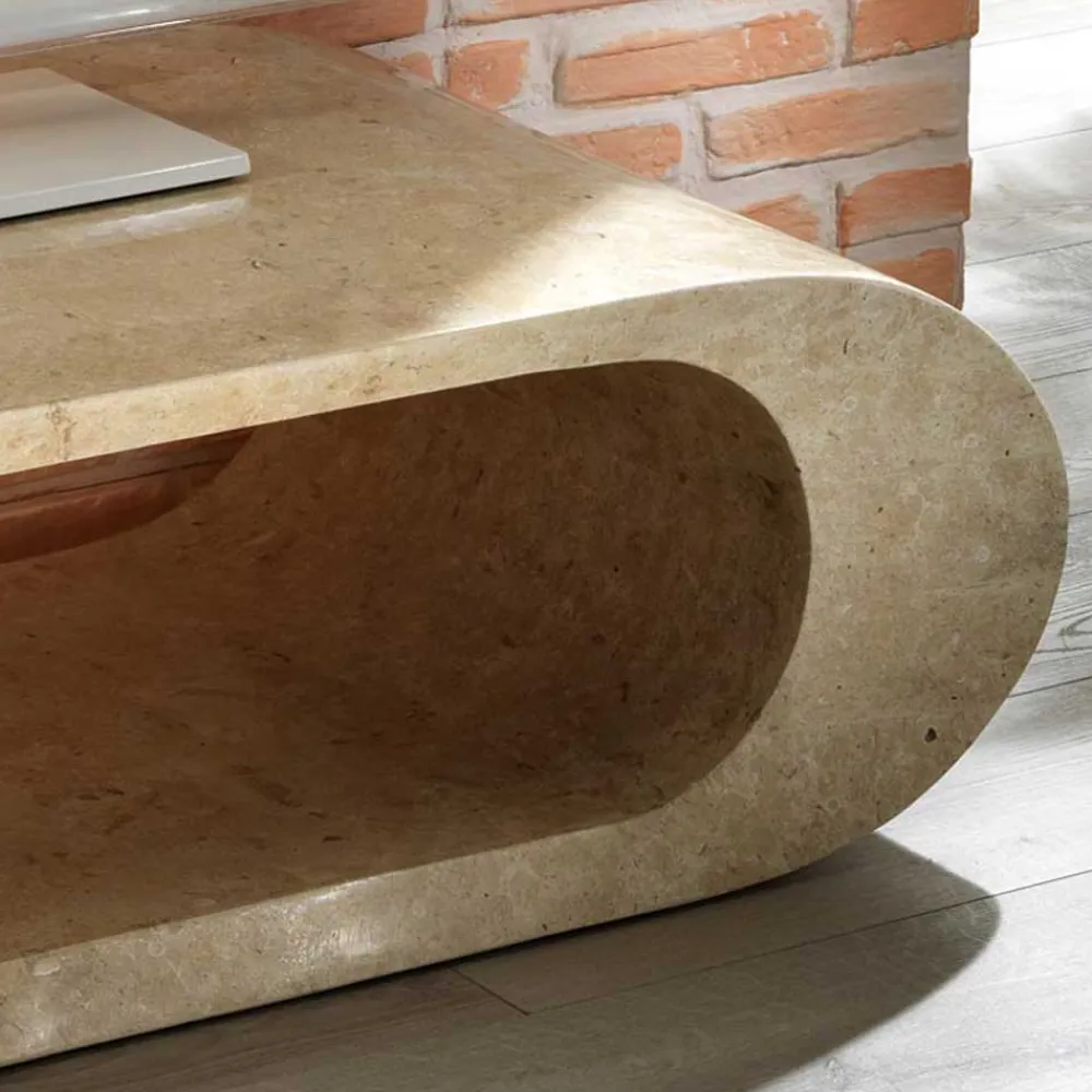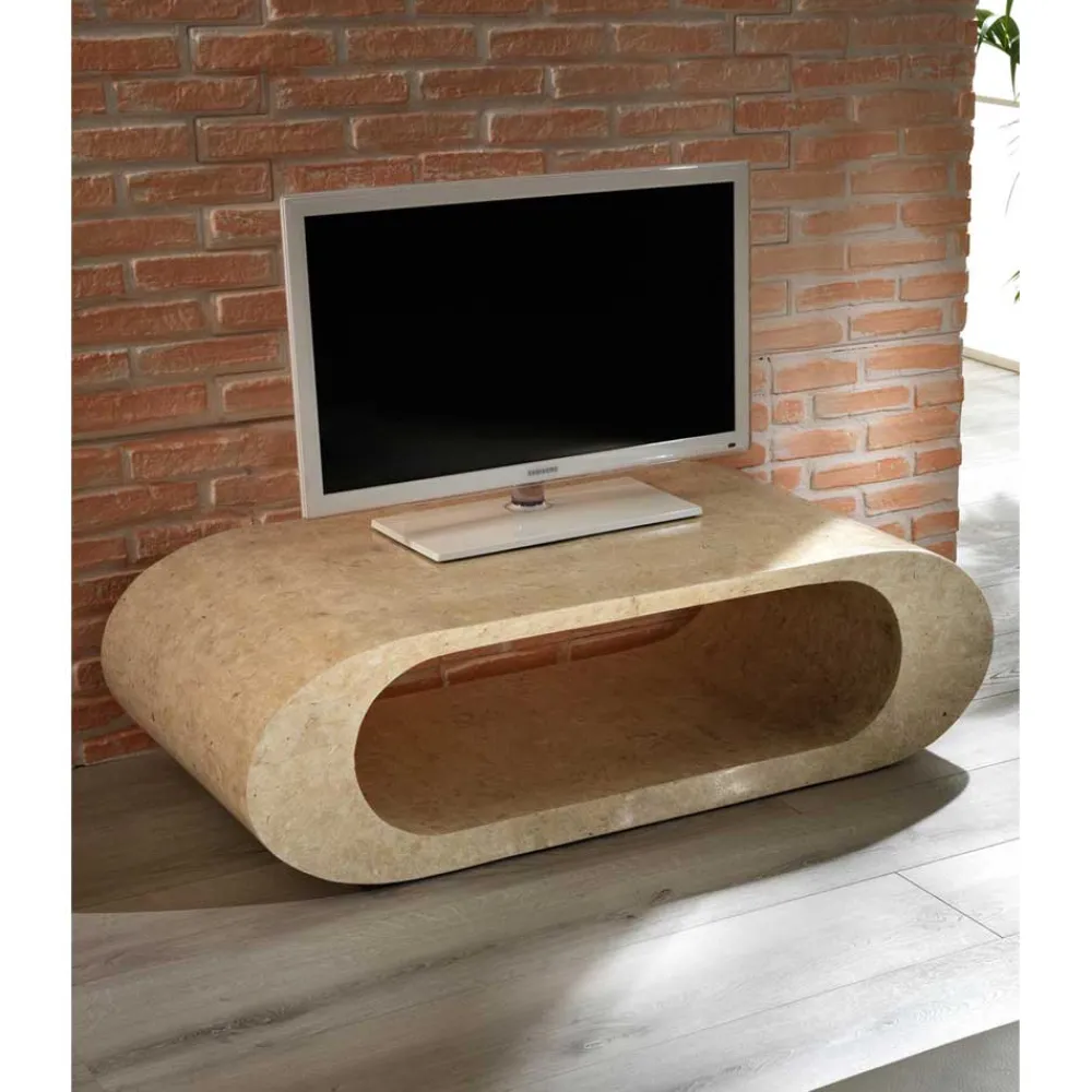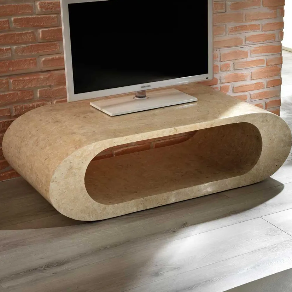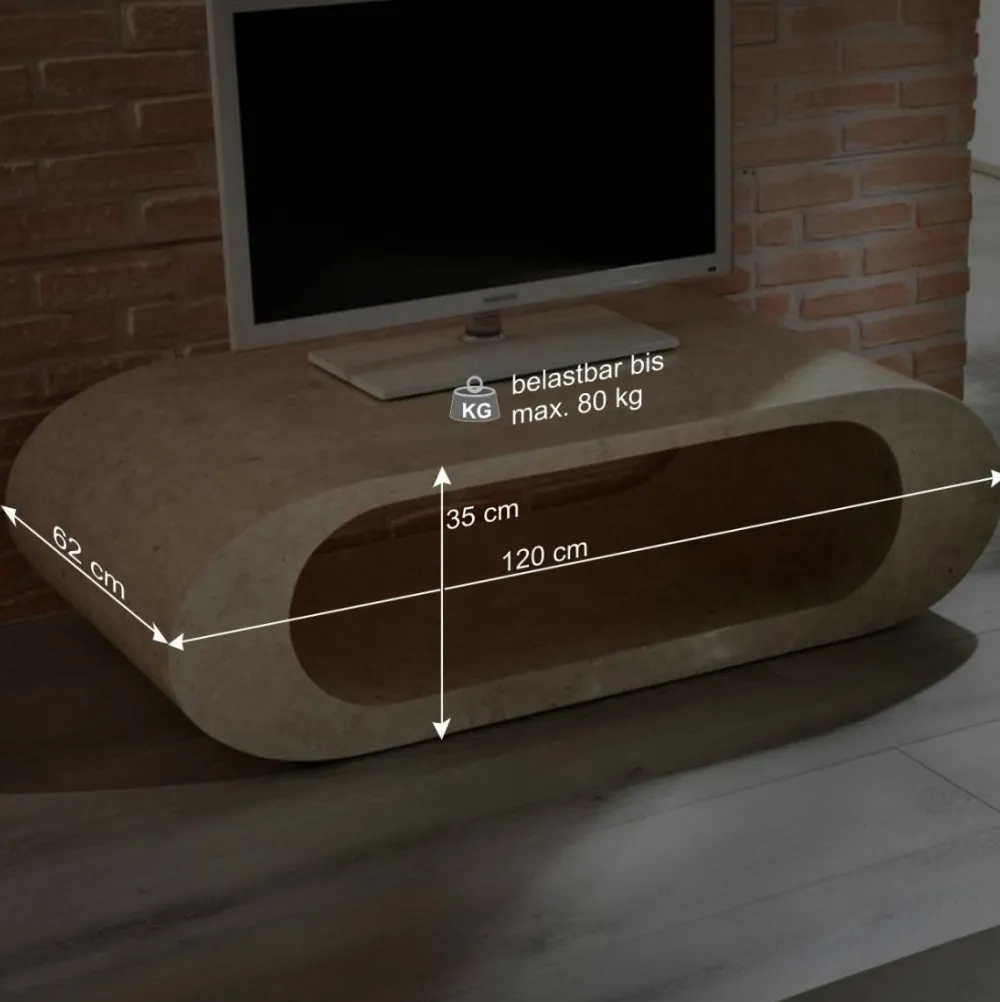Der ovale Fernsehtisch „Jon“ ist ein wahres Schmuckstück für jedes Zuhause. Durch seine natürliche Herstellung aus beigem Stein und die schöne Marmorierung ist er ein echter Hingucker. Die Innenkonstruktion besteht aus Holz, wodurch der Tisch eine hohe Stabilität besitzt. Die glatte Oberfläche und die abgerundeten Korpuskanten runden das elegante Design ab.
