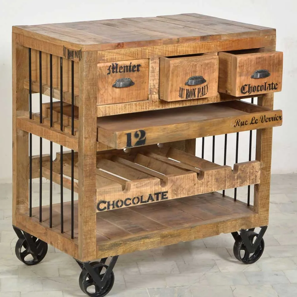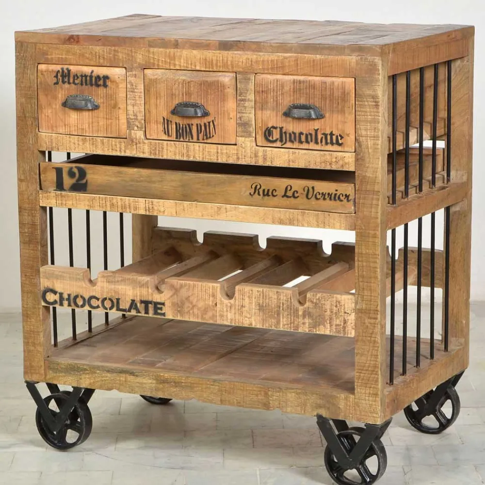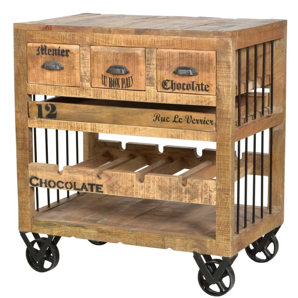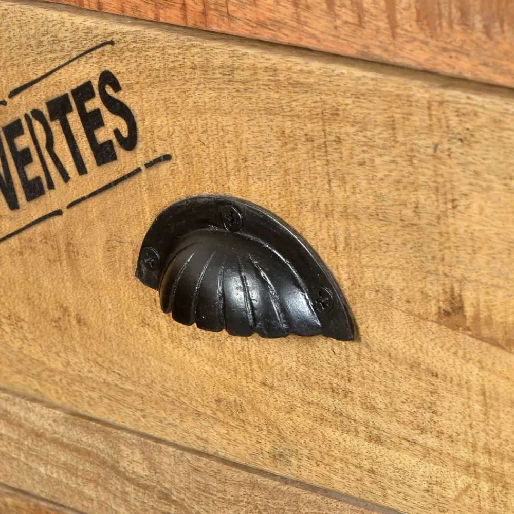 Die Rollen und Muschelgriffe sind in Vintage-Schwarz lackiert und bilden einen eleganten Kontrast zum warmen Mangoholz. Diese Metallelemente unterstreichen den industriellen Look und sorgen für leichte Mobilität.