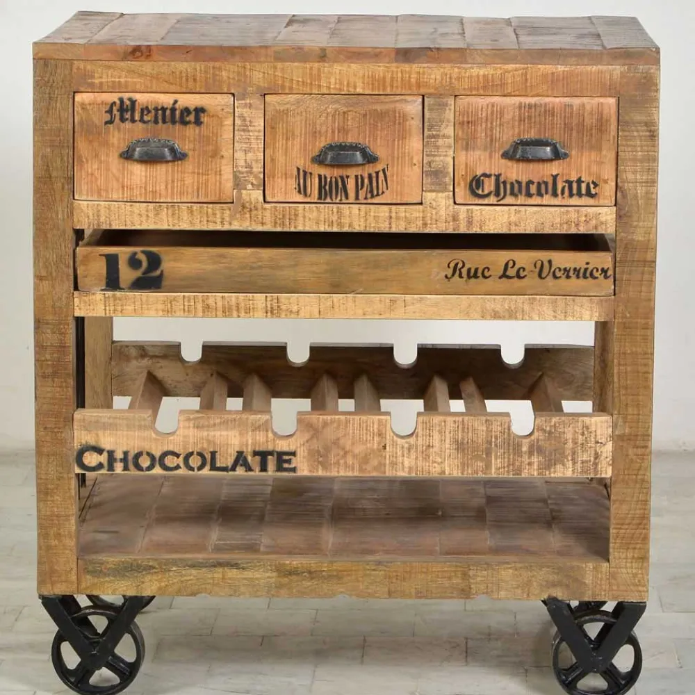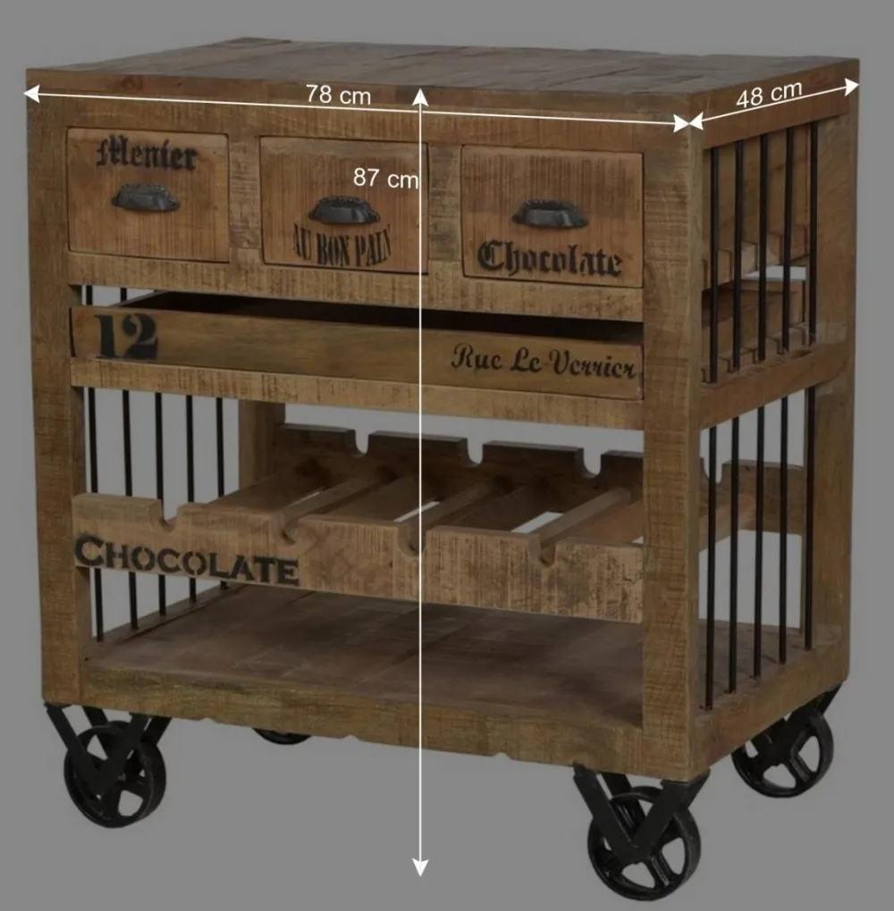 Mit seinen Maßen von 78 cm Breite, 87 cm Höhe und 48 cm Tiefe, bietet der Servierwagen „Indri“ viel Stauraum. Drei große Schubladen mit Holzauszug ermöglichen eine übersichtliche Aufbewahrung, während das ausziehbare Tablett und die Flaschen-Ablage für vier Flaschen zusätzliche Funktionalität bieten. Das offene Staufach und die Seiten mit Metallstangen runden das Design perfekt ab.