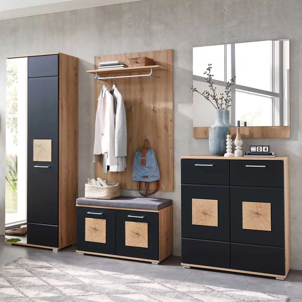 - Kontraststarke Garderobenmöbel in Schwarz matt und Wildeichefarben