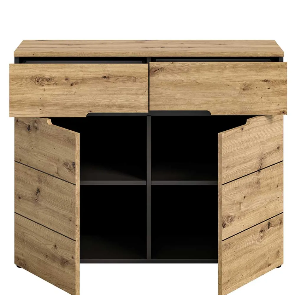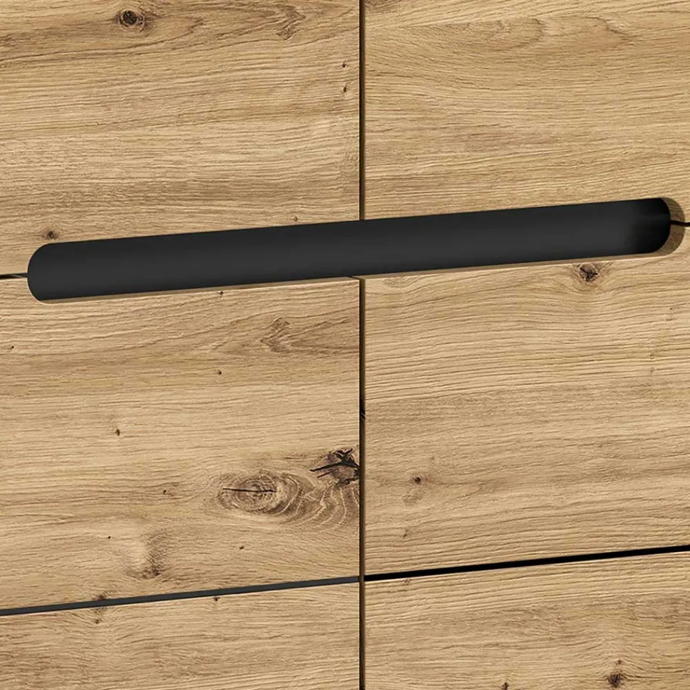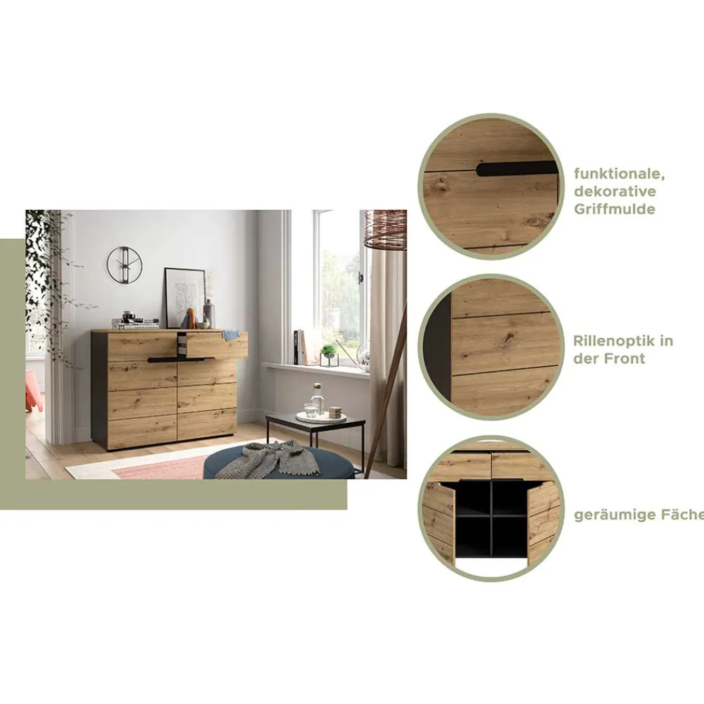 Gefertigt aus robuster Spanplatte, überzeugt die Kommode durch Stabilität und eine angenehme Haptik. Die melaminbeschichteten Oberflächen in Wildeiche-Optik und Grau sind nicht nur optisch ansprechend, sondern auch pflegeleicht und widerstandsfähig gegen alltägliche Beanspruchung. Die präzise Verarbeitung macht „Norja“ zu einem langlebigen Möbelstück für Ihr Zuhause.