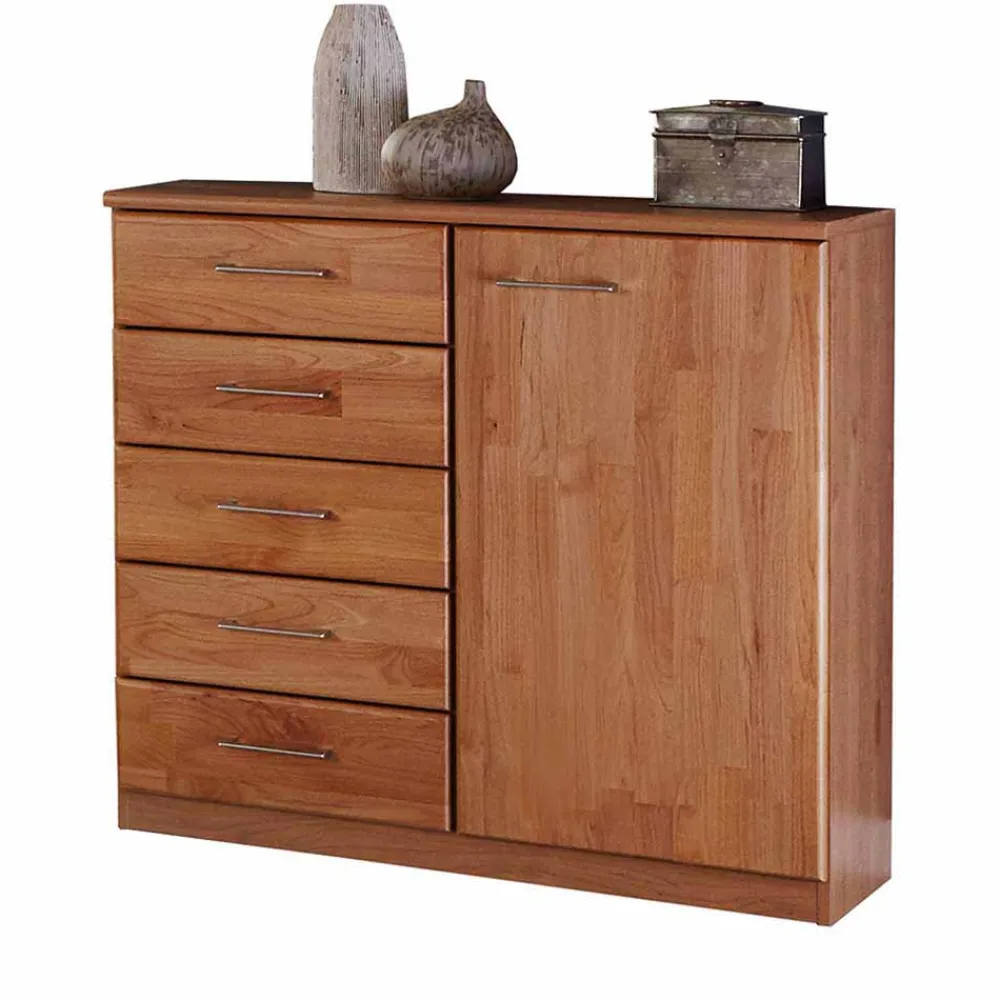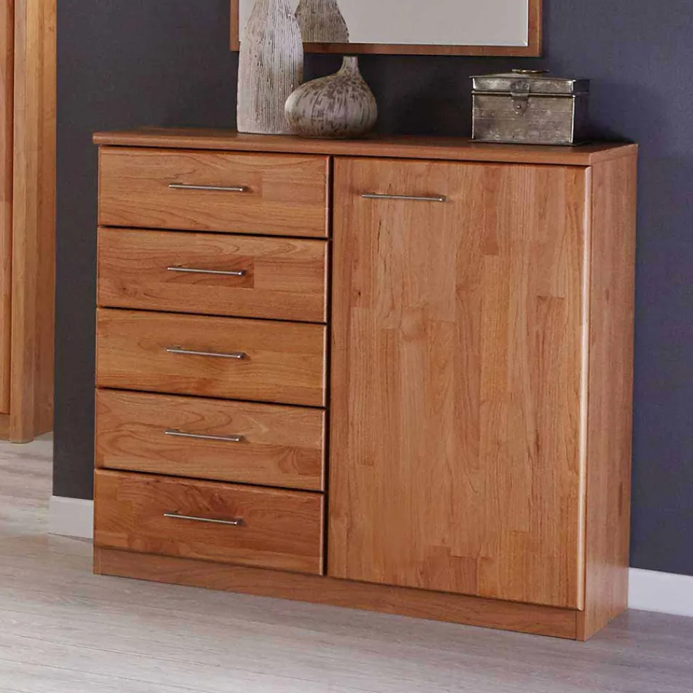Die Front der Kommode ist aus massivem Erlenholz gefertigt, bekannt für seine Robustheit und Langlebigkeit. Erlenholz ist zudem leicht zu bearbeiten und überzeugt durch seine warme, rötliche Farbgebung, die Ihrem Raum eine behagliche Atmosphäre verleiht. Der Korpus, Sockel und die Abdeckplatte aus robuster Spanplatte im Holzdekor Erle foliert, bieten eine kosteneffiziente, dennoch attraktive Lösung. Die Folierung schützt vor Abnutzung und vereinfacht die Pflege, während die Lackierung des massiven Erlenholzes die Maserung betont und für eine pflegeleichte Oberfläche sorgt.
