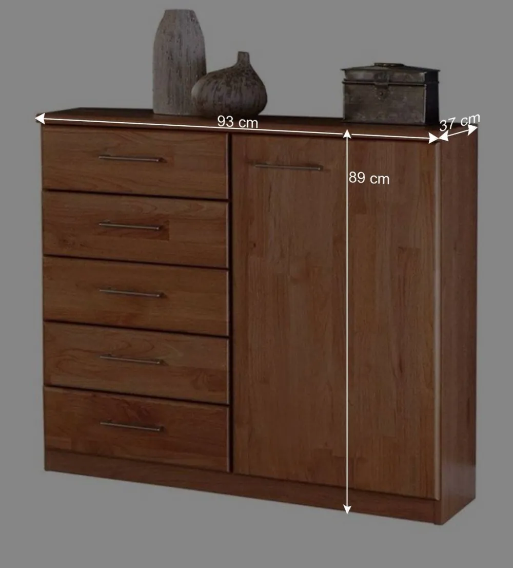 Mit einer Breite von 93 cm, einer Höhe von 89 cm und einer Tiefe von 37 cm bietet diese Kommode viel Stauraum, ohne viel Platz einzunehmen. Die fünf Schubladen auf der linken Seite sind mit einem Metall-Unterflurauszug ausgestattet, der für ein sanftes und leises Öffnen und Schließen sorgt. Auf der rechten Seite befindet sich eine Drehtür, hinter der sich ein praktischer Einlegeboden verbirgt – ideal, um verschiedene Gegenstände ordentlich und griffbereit zu verstauen. Die dezenten Metallgriffe runden das Design ab und bieten eine angenehme Haptik.