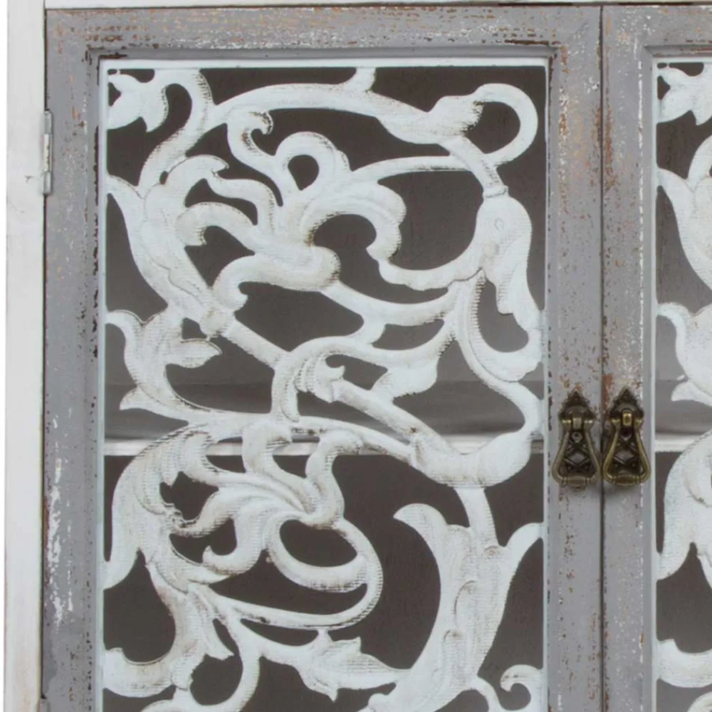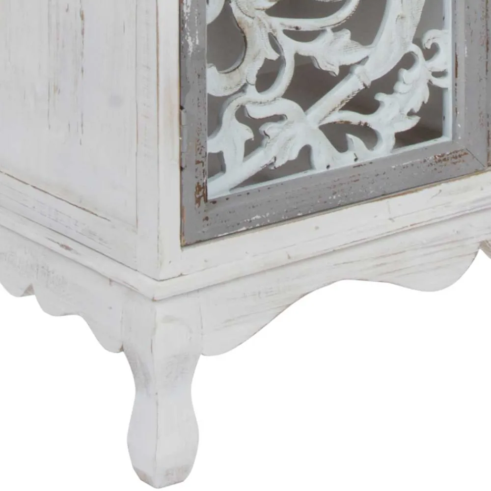 Mit einer Breite von 68 cm, einer Höhe von 89 cm und einer Tiefe von 35 cm integriert sich diese Kommode mühelos in jeden Raum. Die zwei Schubladen mit pastellbunten Fronten und feinen Porzellangriffen bieten idealen Stauraum für kleinere Gegenstände. Die floral geschnitzten Türen unterstreichen den romantischen Look und schützen den Inhalt auf elegante Weise. Der Innenboden aus Sperrholz sorgt für zusätzliche Stabilität und trägt selbst schwerere Gegenstände.