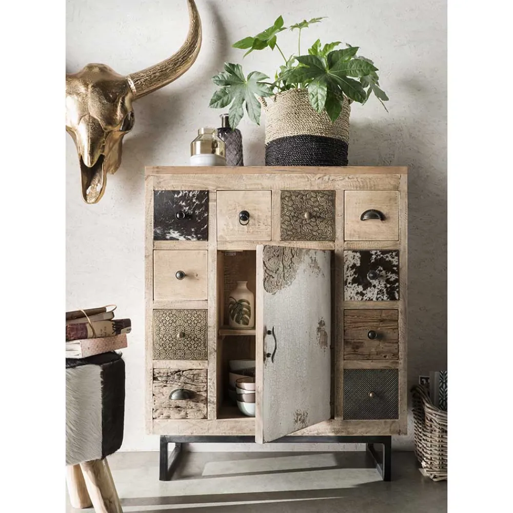 Mit einer Breite von 85 cm, einer Höhe von 103 cm und einer Tiefe von 32 cm bietet die Kommode „Antra“ reichlich Stauraum. Hinter einer Tür verbirgt sich ein praktischer Einlegeboden. Zehn Schubkästen in unterschiedlichen Größen, ausgestattet mit Holzauszügen, bieten Platz für diverse Kleinigkeiten. Die verschiedenen Knopf-, Muschel-, Ring- und Bügelgriffe aus Metall unterstreichen den individuellen Charakter des Möbelstücks.