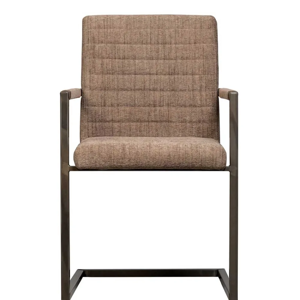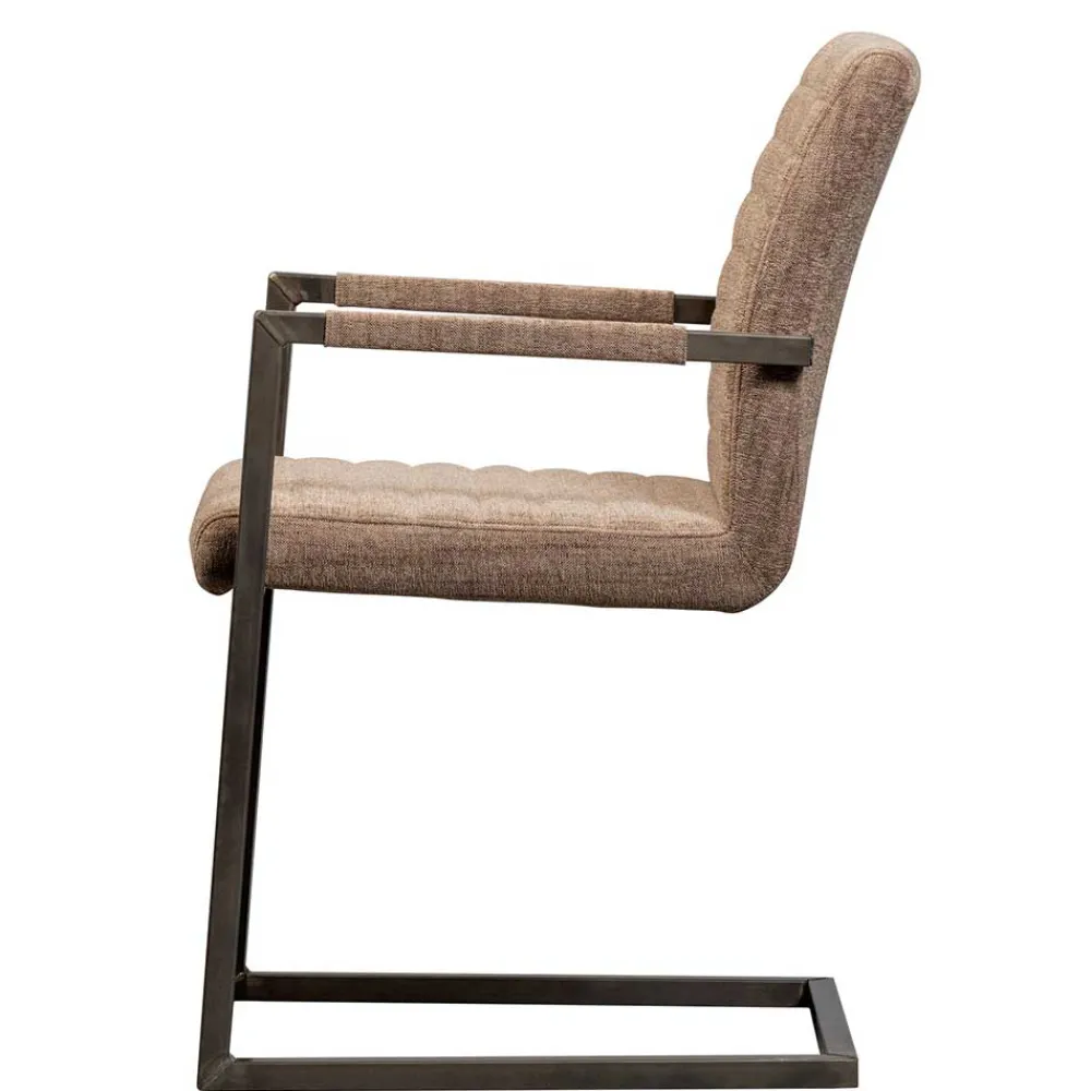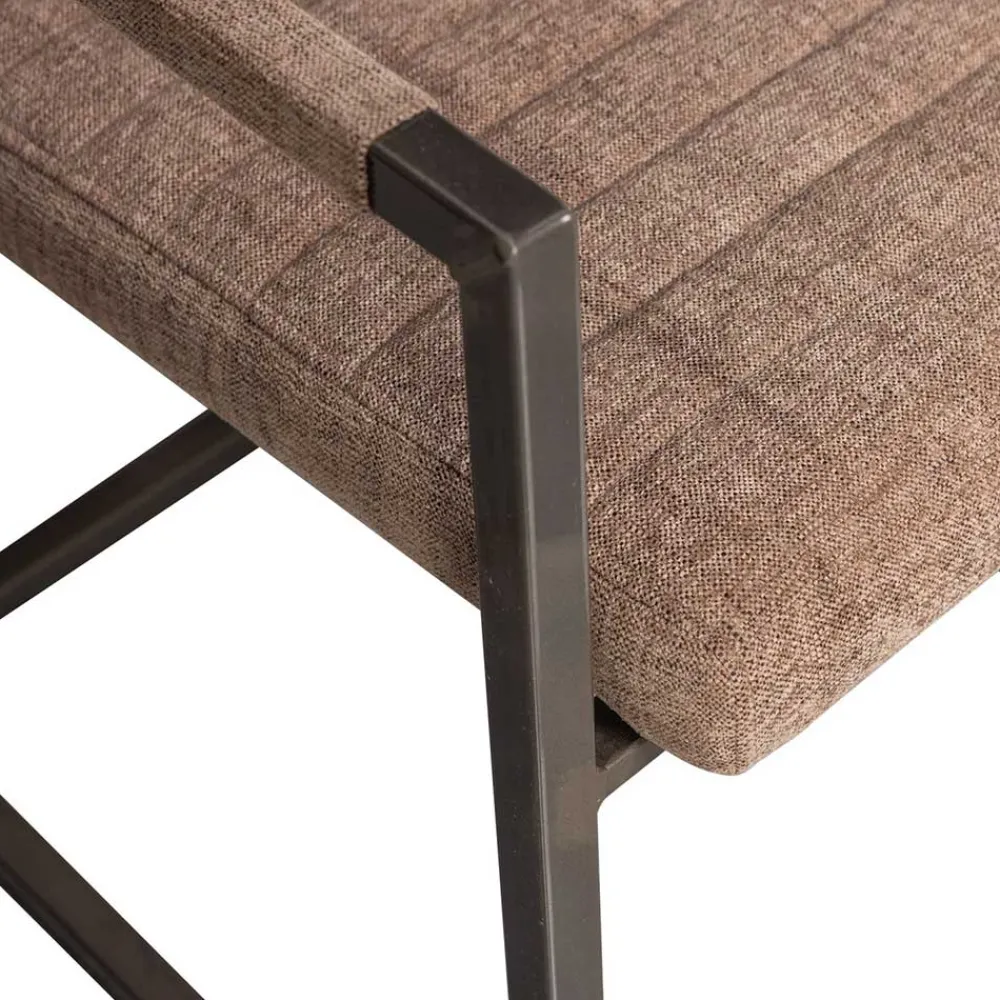 Der Sitz und die Rückenlehne sind mit einem robusten Webstoff bezogen, der aus 94 % Polyester und 6 % Nylon besteht. Dieses Material zeichnet sich durch eine hohe Strapazierfähigkeit aus und bleibt auch bei täglichem Gebrauch in Topform. Die angenehm weiche Schaumstoffpolsterung sorgt für besten Sitzkomfort, während die leicht nach hinten geneigte Rückenlehne eine ergonomische Sitzhaltung unterstützt. Abgerundet wird das Design durch kantige Metallarmlehnen, die für zusätzlichen Komfort mit Stoff bezogen sind.