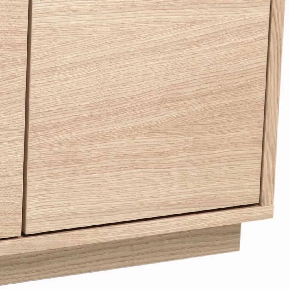 Die Oberfläche ist aufwendig mit einem Eiche-Furnier im Whitewash-Verfahren veredelt und anschließend lackiert. Diese Veredelung schützt das Holz nicht nur zuverlässig vor Feuchtigkeit und Abnutzung, sondern lässt auch die natürliche Maserung dezent durchscheinen – für eine wohnliche, helle Atmosphäre mit langlebigem Schutz.