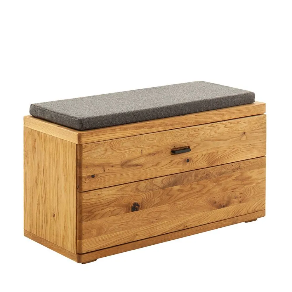 Die Garderobenbank „Robats“ überzeugt mit ihrer soliden Konstruktion und den geölten Oberflächen aus Balkeneiche Massivholz sowie einem Korpus mit Wildeiche Furnier. Diese hochwertigen Materialien sorgen für Stabilität und ein edles Erscheinungsbild, das sich harmonisch in Ihren Eingangsbereich einfügt.