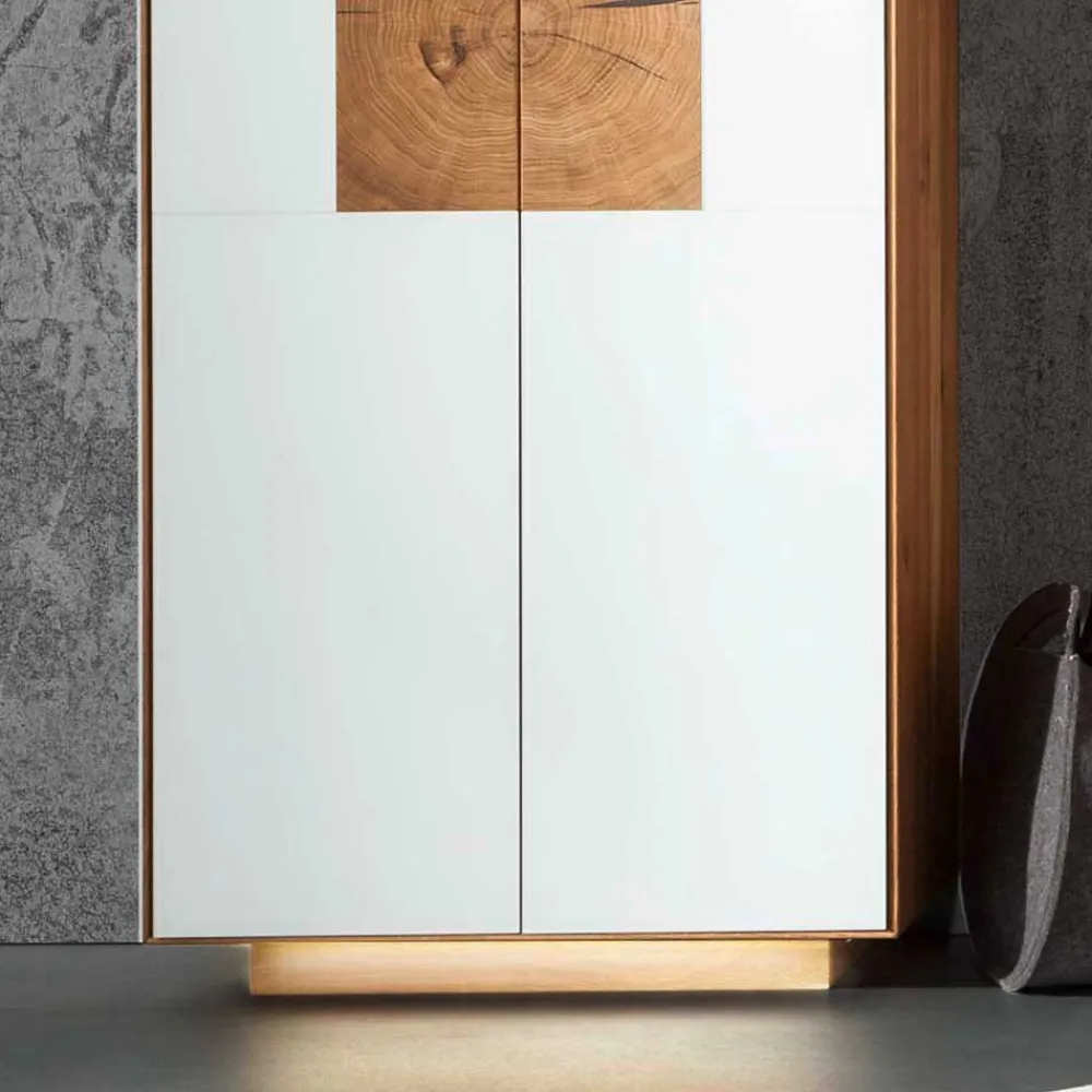 - Türen aus solider MDF mit satinierter Glasfront in Weiß und einer einzigartigen Applikation aus Hirnholz