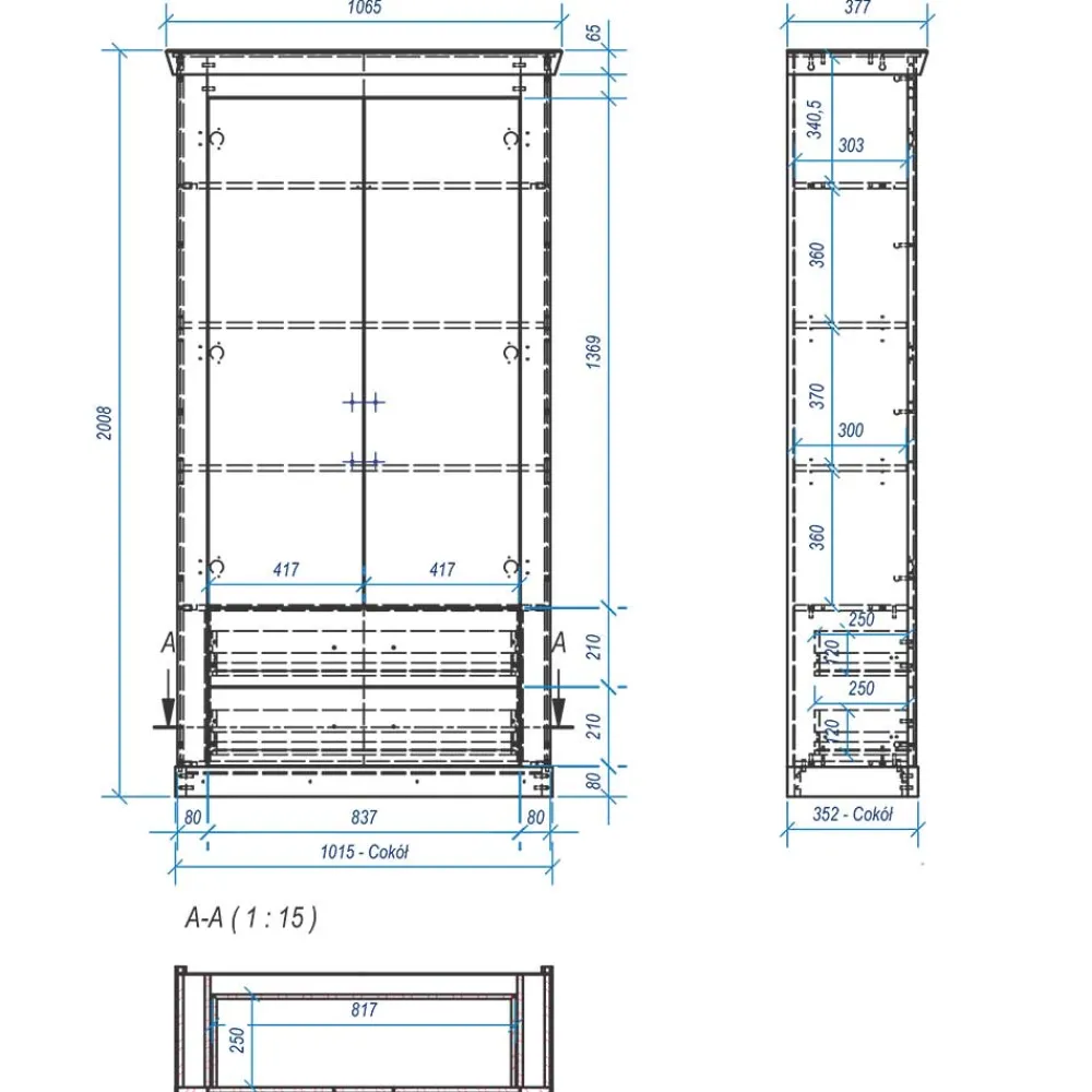 - Innen ein Konstruktionsboden mit ausziehbarer Kleiderstange und zwei Einlegeböden