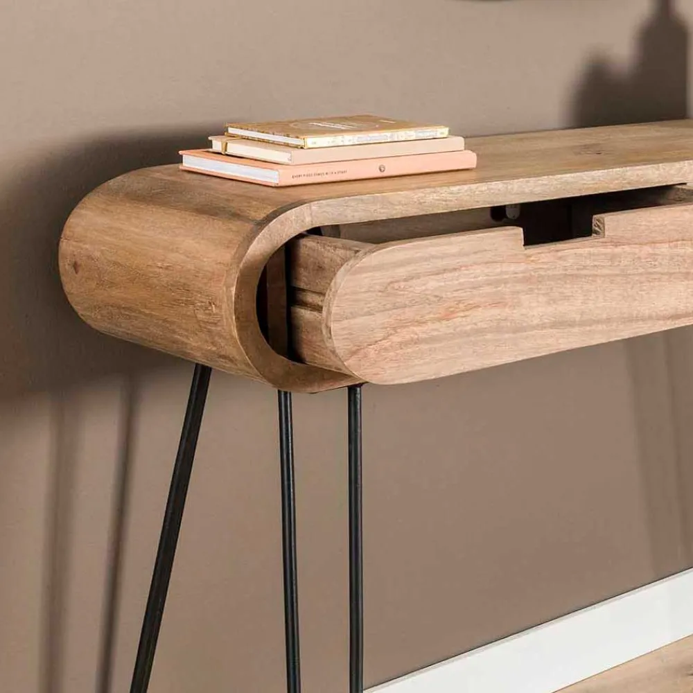 Neben seinem ästhetischen Reiz bietet Vioriga praktischen Stauraum. Zwei Schubladen mit robustem Holzauszug bieten Platz für Accessoires, Schmink- oder Schreibutensilien, wobei die kantigen Grifflöcher eine einfache Handhabung gewährleisten.