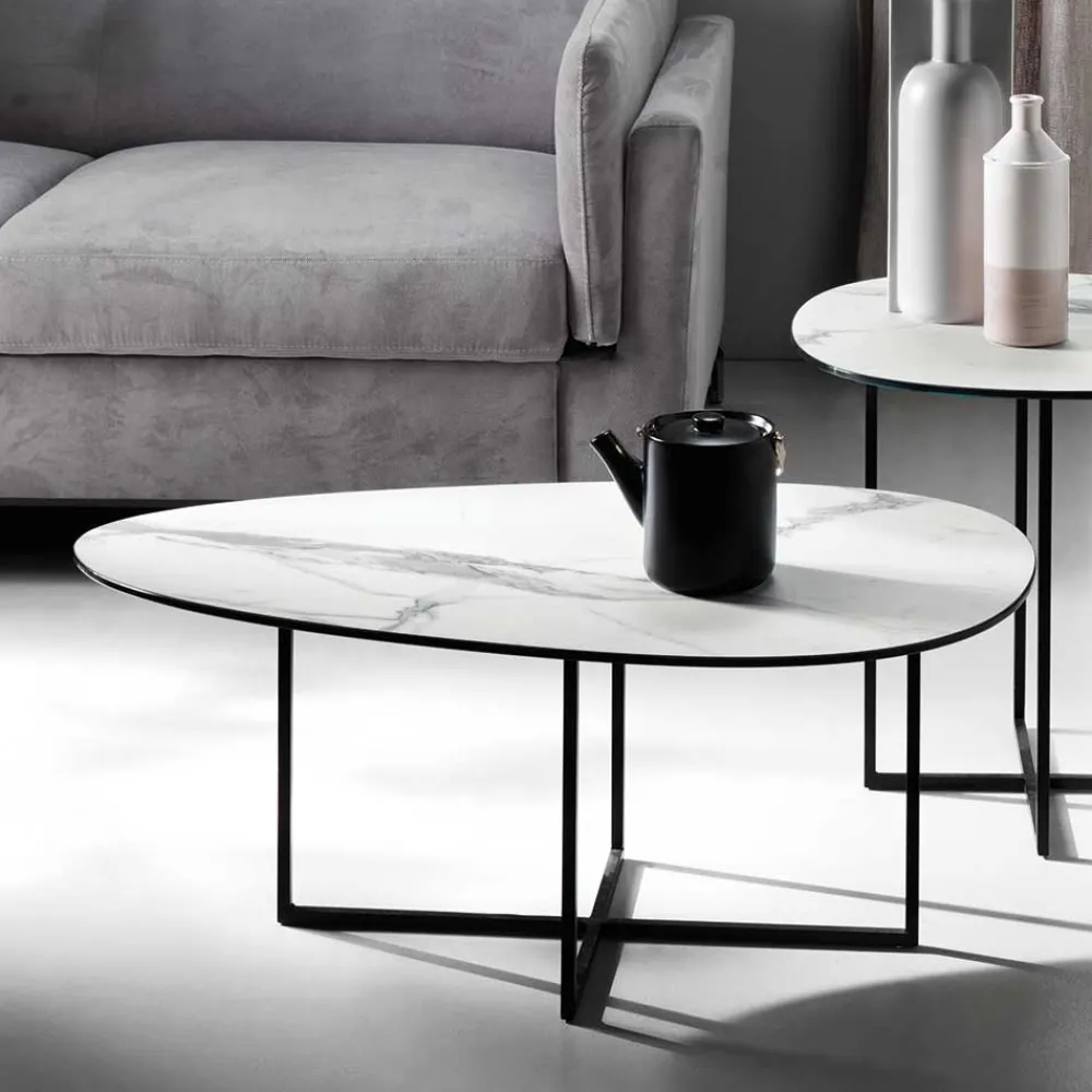 Umrahmt wird diese elegante Platte von einem feinen, schwarzen Metallrahmen, der das Design stilvoll abrundet und dem Tisch eine klare Kontur verleiht. Der Kontrast zwischen der hellen Marmoroptik und dem dunklen Rahmen bringt visuelle Tiefe in Ihren Wohnraum und lässt den Tisch sowohl in hellen als auch in dunkleren Interieurs erstrahlen.