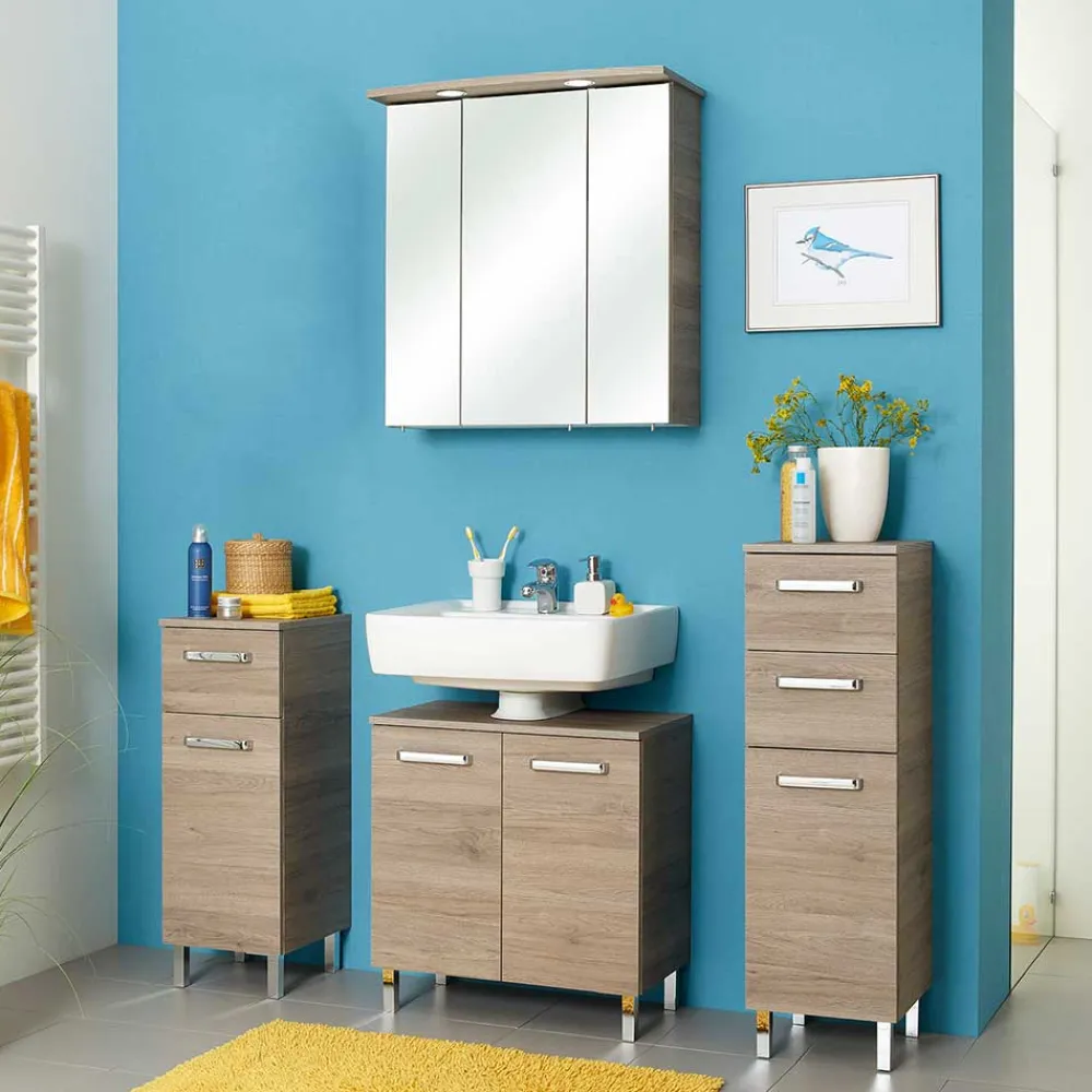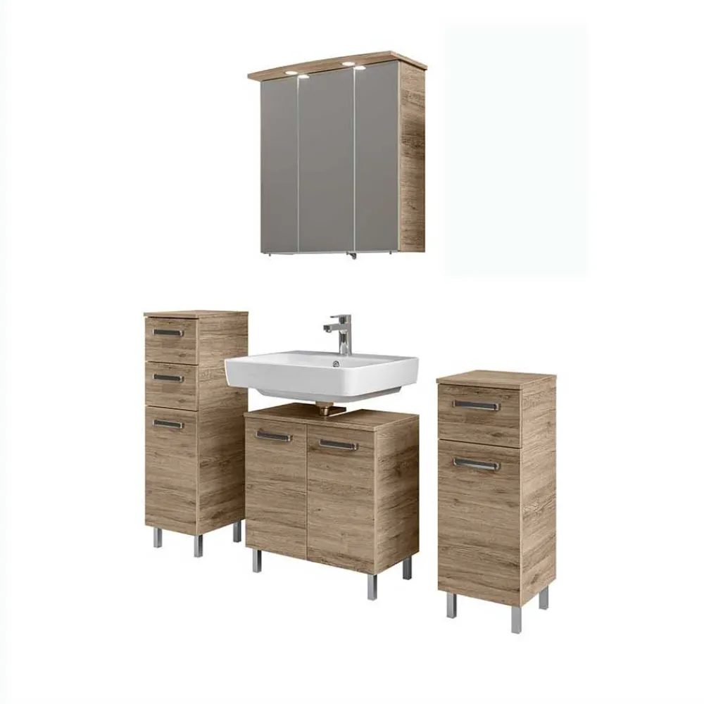 Mit der vierteiligen Bad-Kompletteinrichtung „Lemi“ bringen Sie frischen Schwung in Ihr Badezimmer. Die warme Eiche San Remo-Holzoptik und das klare, zurückhaltende Design machen „Lemi“ zur idealen Wahl für ein einladendes und modernes Ambiente. In hochwertiger deutscher Produktion gefertigt, besticht das Set nicht nur durch eine ansprechende Optik, sondern auch durch die Verarbeitung langlebiger Materialien, die eine langjährige Nutzung sicherstellen.