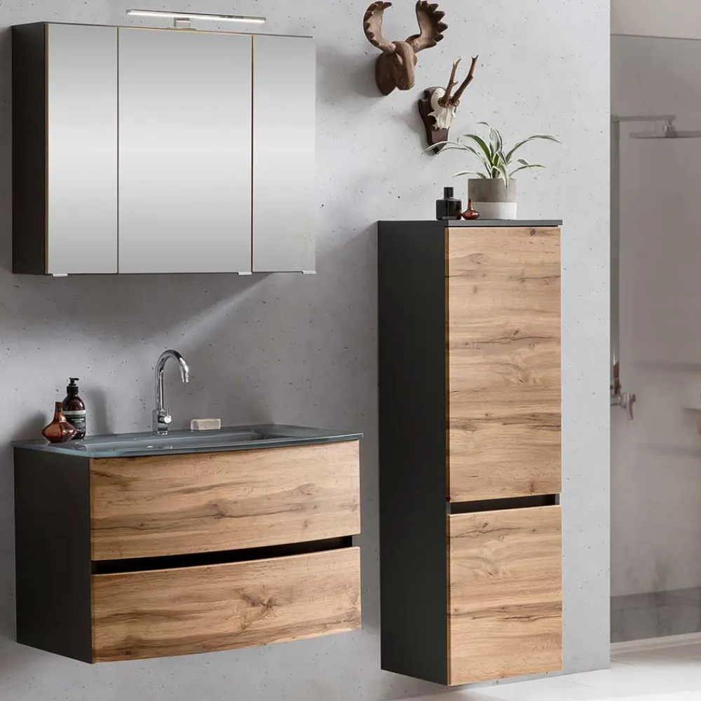 Der Korpus besteht aus robuster Spanplatte und ist mit einer pflegeleichten, melaminbeschichteten Oberfläche in Dunkelgrau versehen. Diese Beschichtung sorgt nicht nur für Widerstandsfähigkeit gegen Feuchtigkeit und Kratzer, sondern lässt sich auch mühelos reinigen – ideal für den täglichen Gebrauch im Badezimmer. Die Fronten aus MDF sind in Wildeiche-Holzoptik foliert und verleihen dem Möbelstück seine authentische, natürliche Wirkung. Ergänzt wird das Ensemble durch glänzendes Spiegelglas, das das Licht sanft reflektiert und den Raum optisch vergrößert.