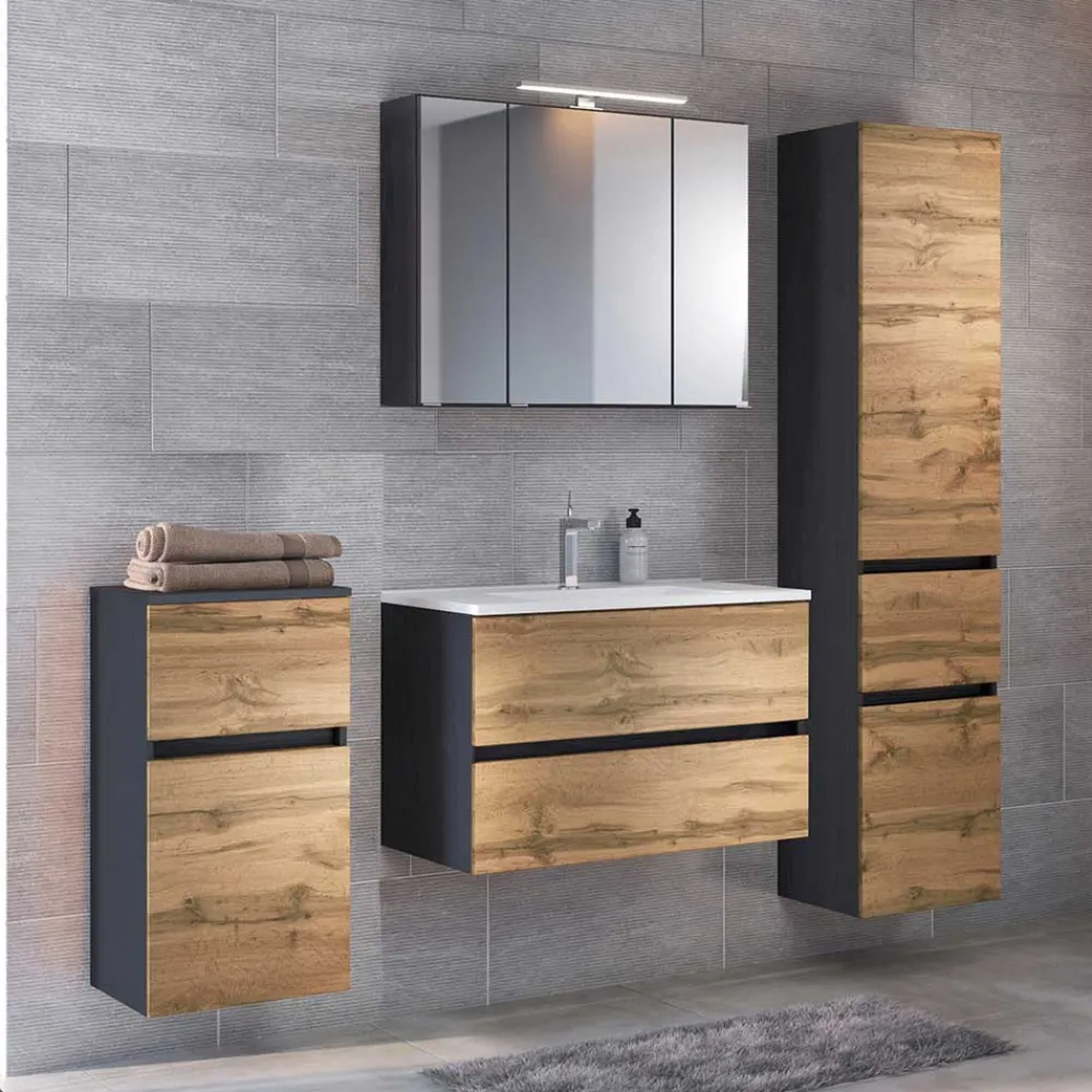Das Set besteht aus einem Hochschrank, einem Spiegelschrank, einem Unterschrank und einem Waschtisch. Die Korpusse, gefertigt aus robuster Spanplatte, sind in einem tiefen Anthrazitton melaminbeschichtet, welches für seine Widerstandsfähigkeit gegen Kratzer und Feuchtigkeit bekannt ist. Die Fronten aus MDF in Wildeicheholzoptik verleihen den Stücken durch die Foliertechnik eine täuschend echte Holzästhetik, verbunden mit einer leichten Pflege und Langlebigkeit. Der Spiegelschrank, ausgestattet mit einer Front aus Spiegelglas, komplettiert das Set und bietet eine klare Sicht sowie eine optische Erweiterung des Raumes. Die Rückwände im Spiegelschrank sowie im Hoch- und Unterschrank sind in einem strahlenden Weiß gehalten, was für eine helle und freundliche Atmosphäre sorgt.