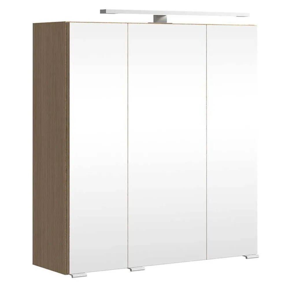 Spiegelschrank: Der Spiegelschrank (60x64x20 cm) ist mit drei Spiegeltüren ausgestattet, wobei die mittlere Tür breiter als die beiden äußeren ist. Mit praktischen Metallgriffen und einer LED-Aufsatzleuchte ist dieser Schrank ein echtes Highlight. Gewicht: ca. 18,3 kg.