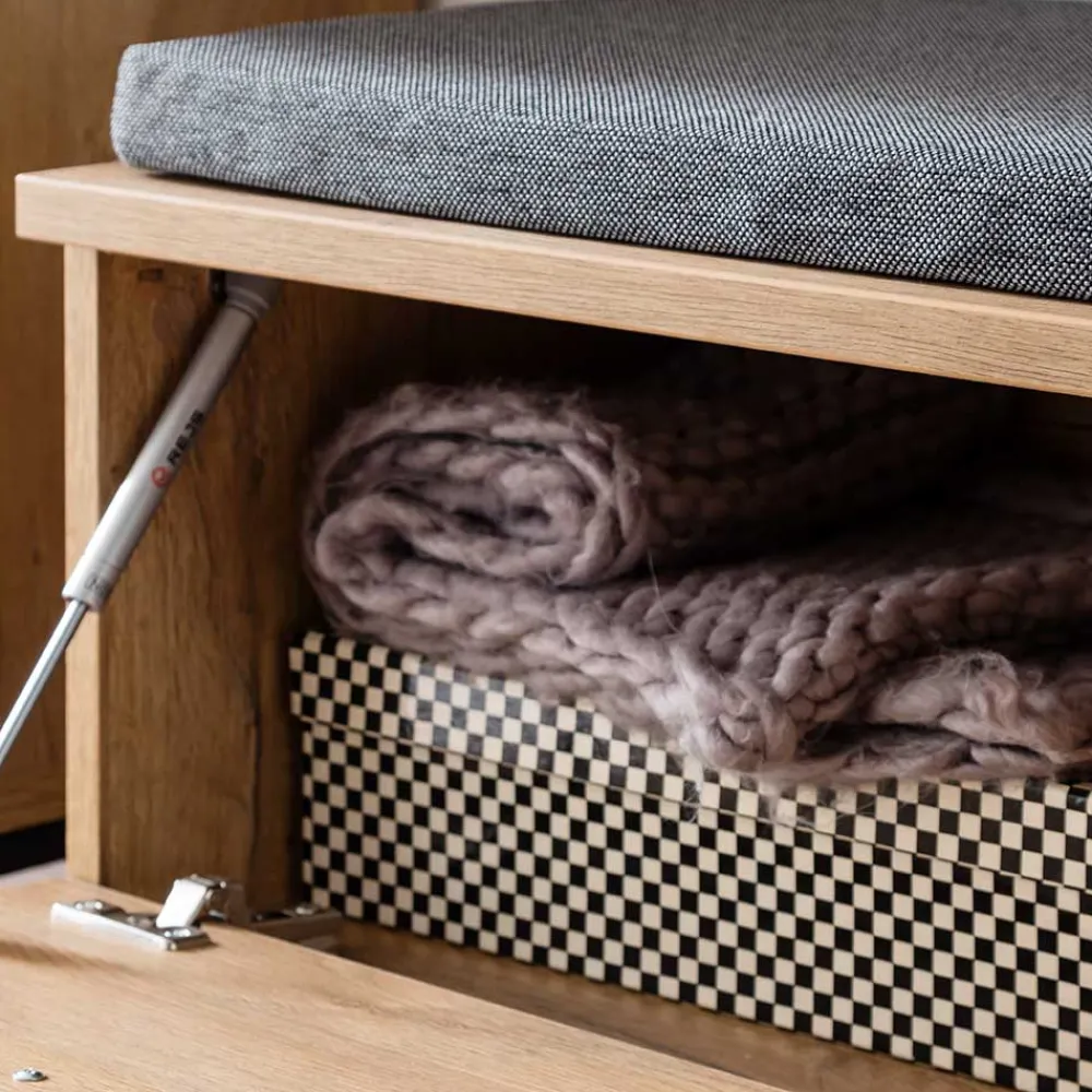 - Zwei Klappen mit Dämpfung, innen je ein großes Fach, Platz für bis zu vier Paar Schuhe je nach Größe