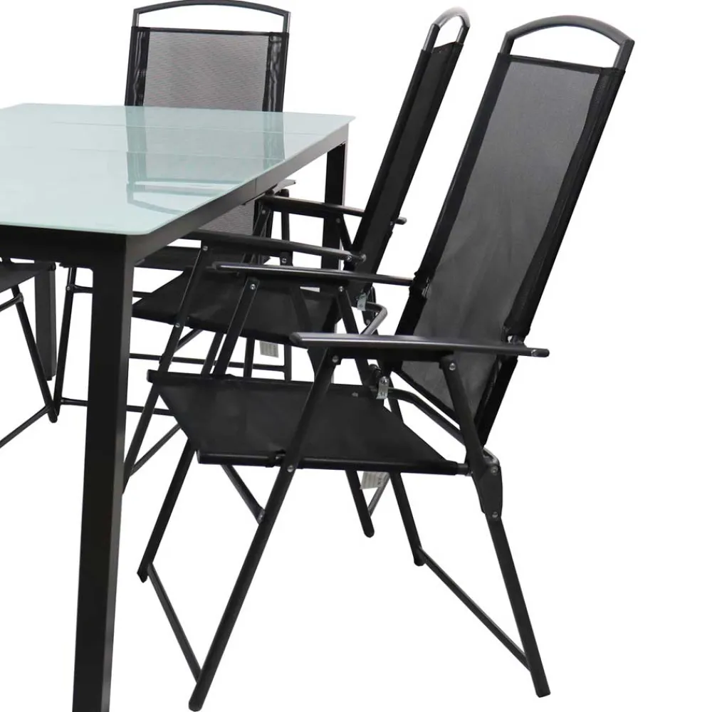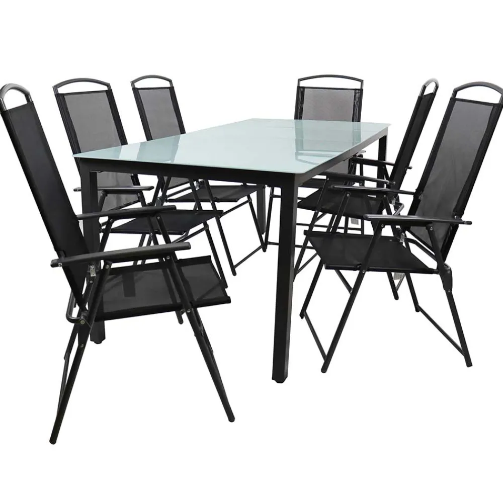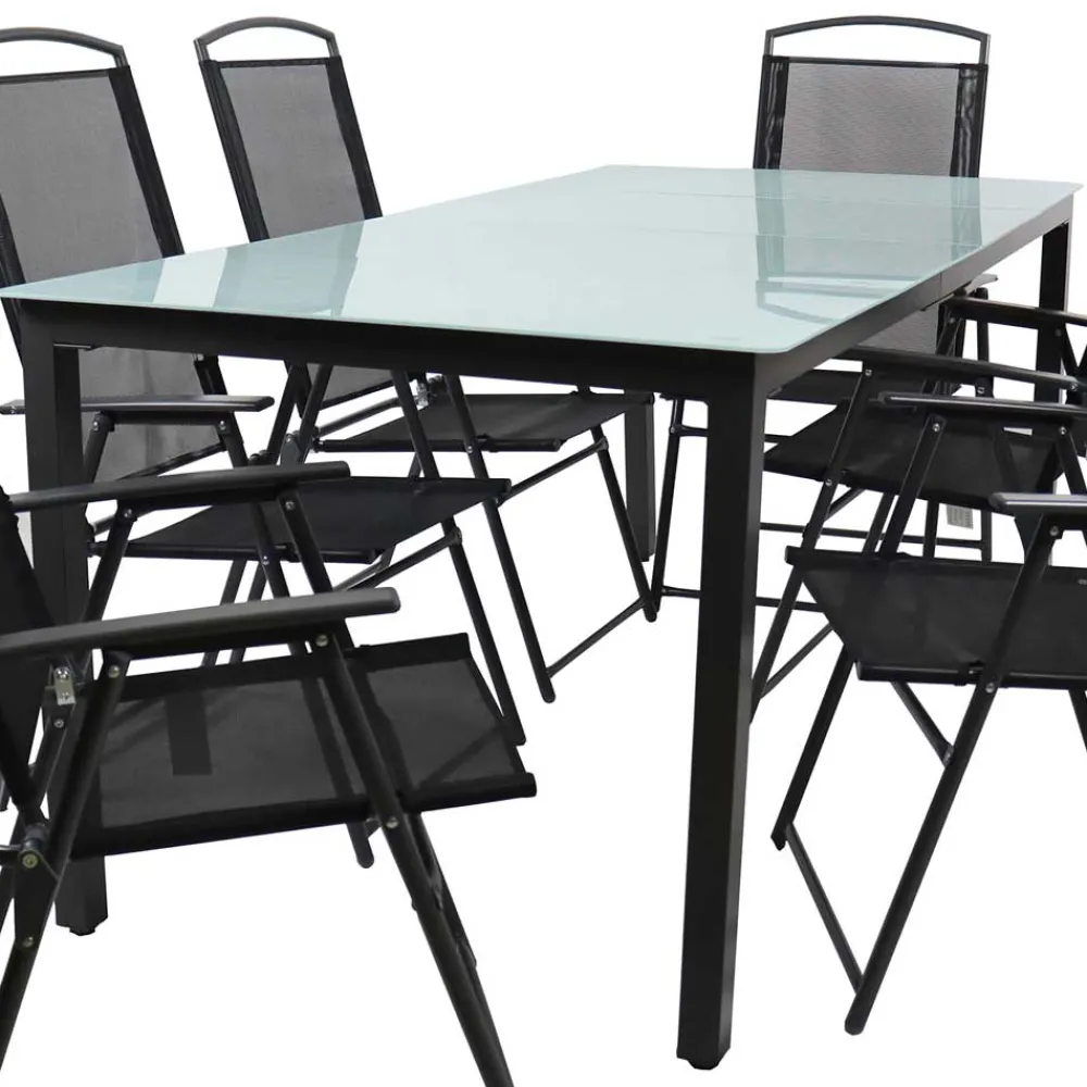 Verwandeln Sie Ihren Garten in eine Oase der Eleganz mit dem Glastisch & Klappstühle Set „Cretania“. Diese zeitlos und solide gestaltete Garten-Sitzgruppe in Schwarz überzeugt durch ihr modernes Design und die hochwertigen Materialien. Ob für ein entspanntes Frühstück im Freien oder eine gesellige Runde mit Freunden – dieses siebenteilige Set bietet ausreichend Platz und Komfort für unvergessliche Momente.