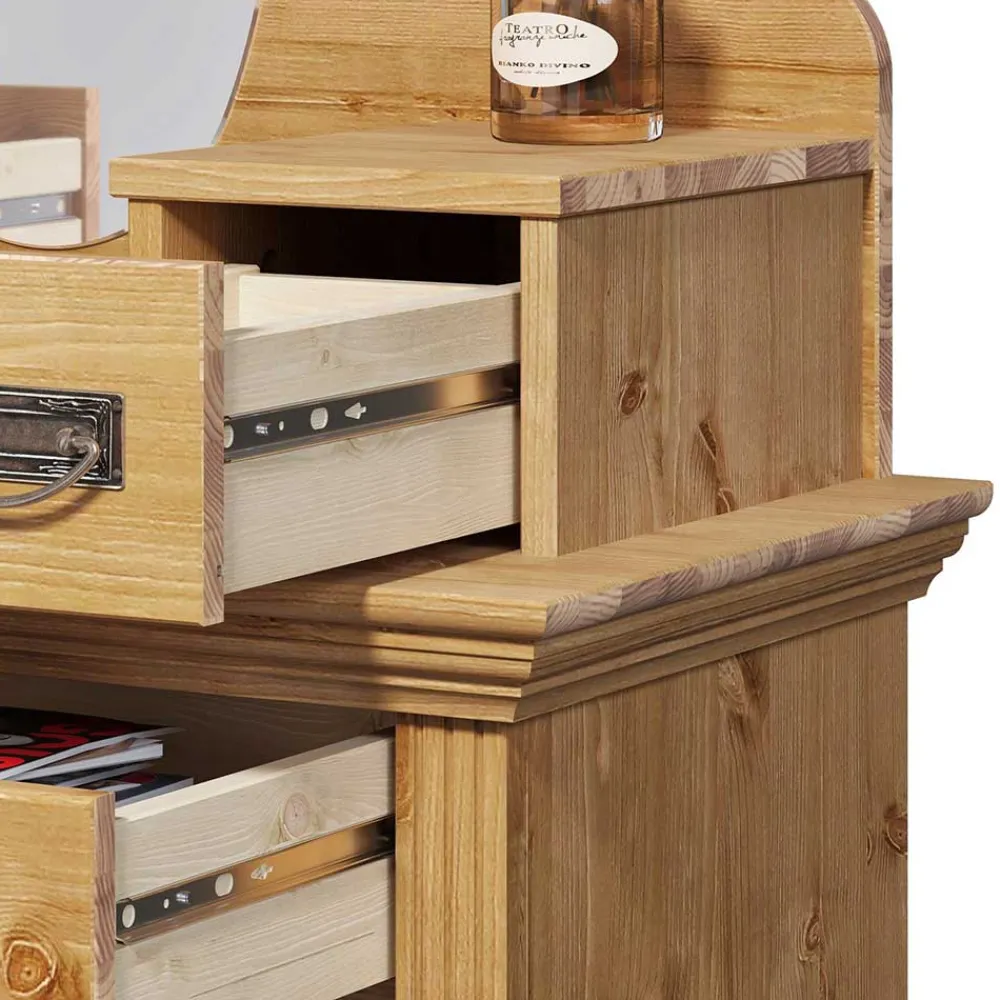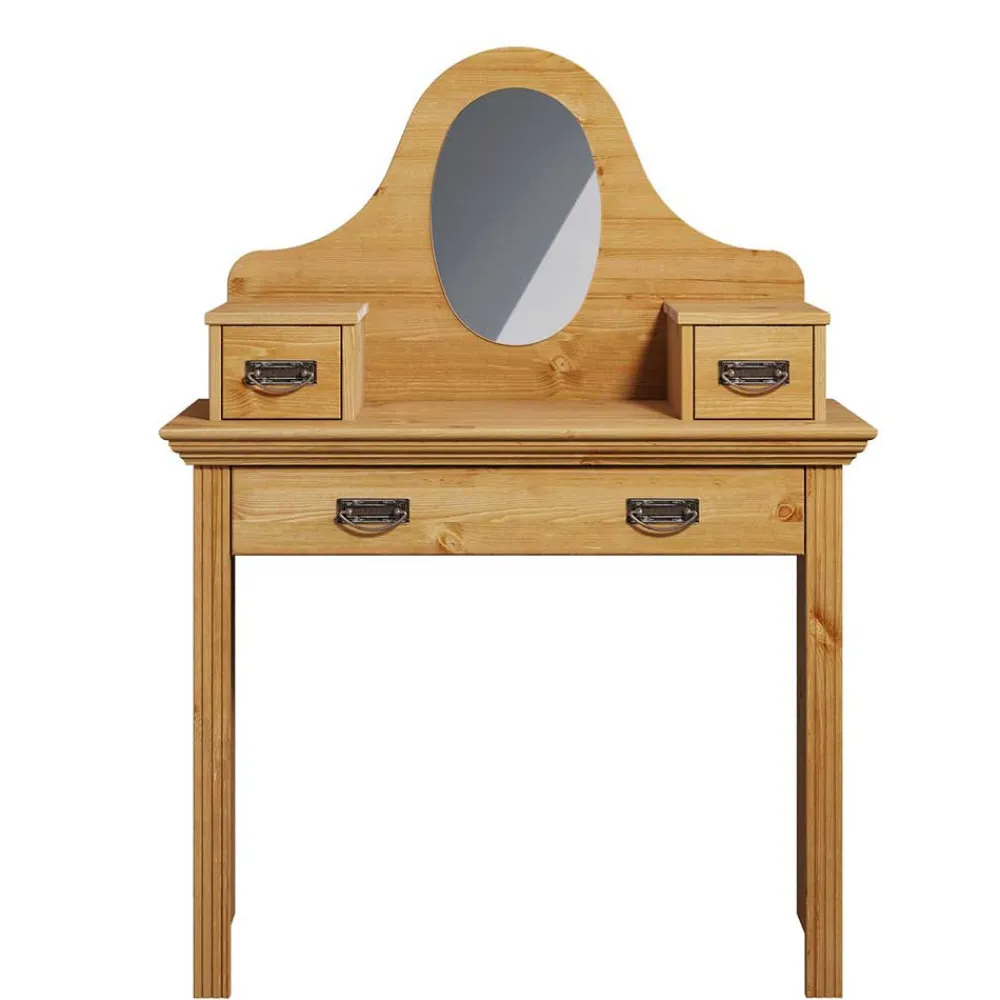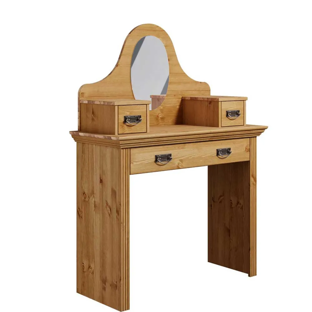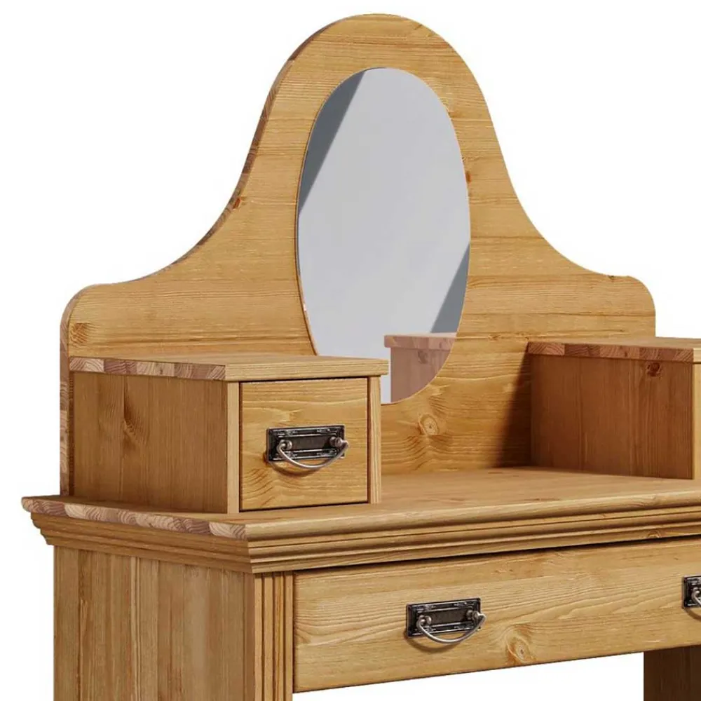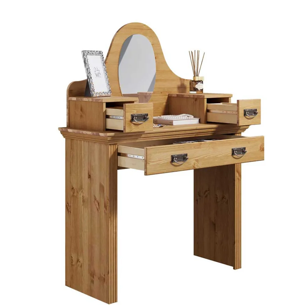 Der Schminktisch „Vocoja“ wird aus massivem Kiefernholz gefertigt, das nicht nur eine wunderschöne Maserung aufweist, sondern auch für seine Robustheit und Langlebigkeit bekannt ist. Die natürliche Beschaffenheit des Holzes verleiht jedem Tisch eine einzigartige und charmante Optik, die sich nahtlos in verschiedene Einrichtungsstile einfügt.