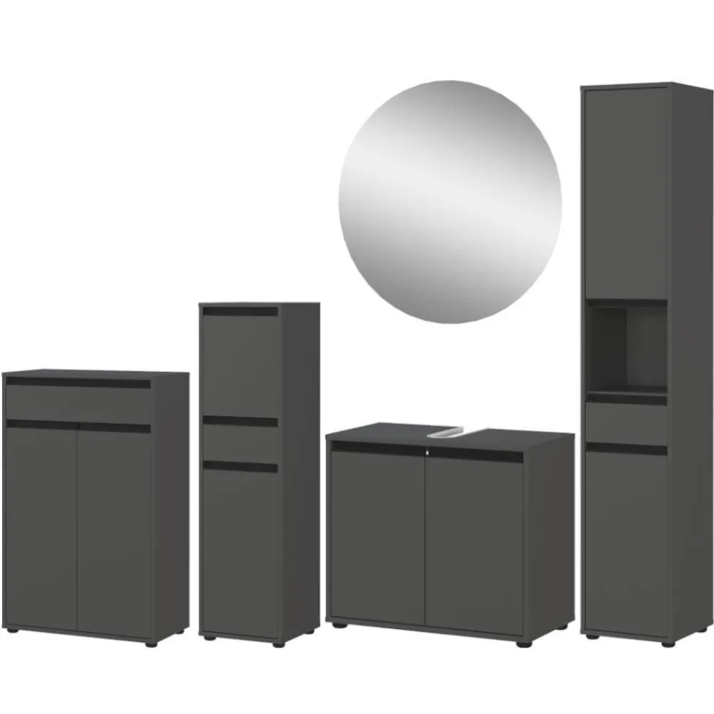 Modernes Design, hochwertige Materialien und durchdachte Funktionalität verschmelzen im Badmöbel-Set „Rufu“ zu einer idealen Lösung für stilbewusste Badezimmer. Bestehend aus einem Hochschrank, einer Kommode, einem Midischrank, einem runden Spiegel sowie einem Waschbeckenunterschrank, präsentiert sich dieses Set in eleganten, dunklen Tönen: Dunkelgrau dominiert die melaminbeschichteten Oberflächen, während die pulverbeschichteten Griffmulden aus schwarzem Metall einen edlen Kontrast setzen.