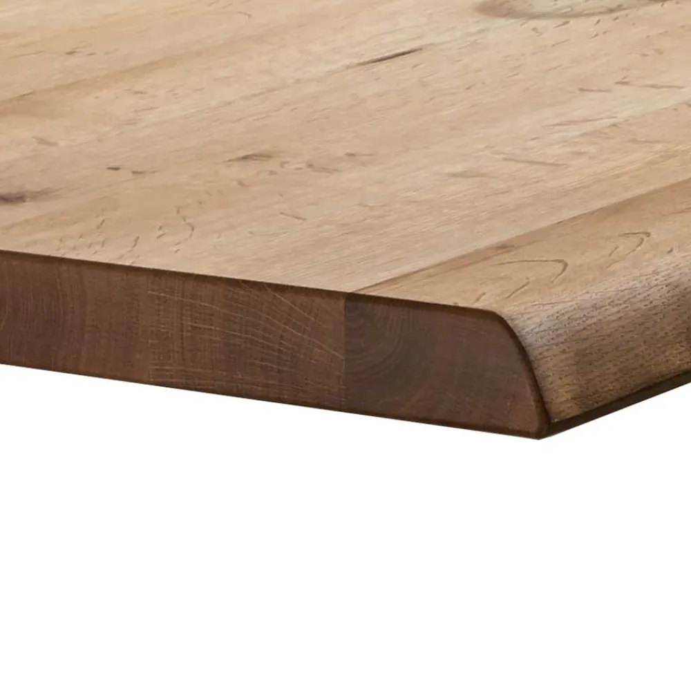 Die solide Tischplatte aus Wildeichenholz, mit einer Stärke von ca. 4 cm, präsentiert sich nicht nur in ihrer robusten Beschaffenheit, sondern auch mit einer natürlichen, geölten Oberfläche, die die lebhafte Maserung des Holzes betont. Risse und Astlöcher sind fachmännisch verspachtelt, was jedem Tisch einen unverwechselbaren Charakter verleiht. Das Highlight bildet die abgerundete, gedrehte Tischkante in angesagter Bootsform, die „Tanina“ zu einem absoluten Blickfang in jedem Raum macht.