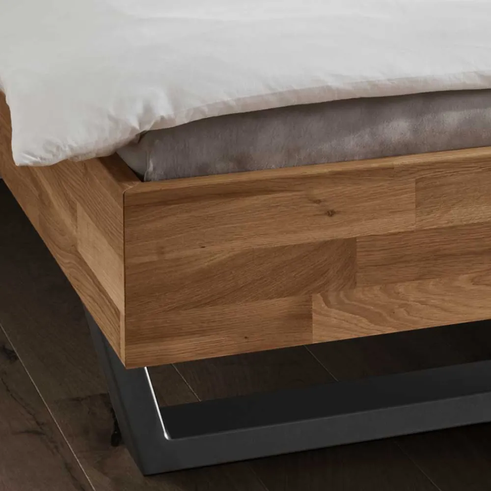 Das zurückgesetzte Kufengestell aus pulverbeschichtetem Metall in Anthrazit schafft einen modernen Kontrast zum natürlichen Holz und sorgt gleichzeitig für maximale Stabilität. Mit einer Höhe von 45 cm beim Fußteil bietet das Bett nicht nur visuelle Balance, sondern auch eine belastbare Konstruktion, die pro Liegeseite bis zu 150 kg trägt.