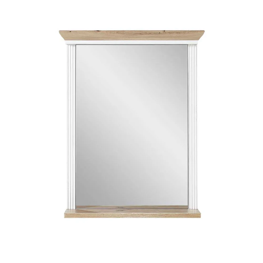 Die Fronten dieser Möbelstücke sind aus MDF gefertigt – ein sehr widerstandsfähiges und langlebiges Material, das sich durch seine homogene Struktur und feine Oberfläche auszeichnet. Der Korpus, bestehend aus robuster Spanplatte, gewährleistet Stabilität und Langlebigkeit. Für ein warmes, natürliches Ambiente sind die Oberflächen in einer Holzoptik Pinie Weiß foliert. Ablagen, Oberböden und Kranzleisten setzen mit ihrer Holzoptik in Eiche optische Akzente. Dekorative Fräsungen an den Fronten runden das stilvolle Gesamtbild ab.