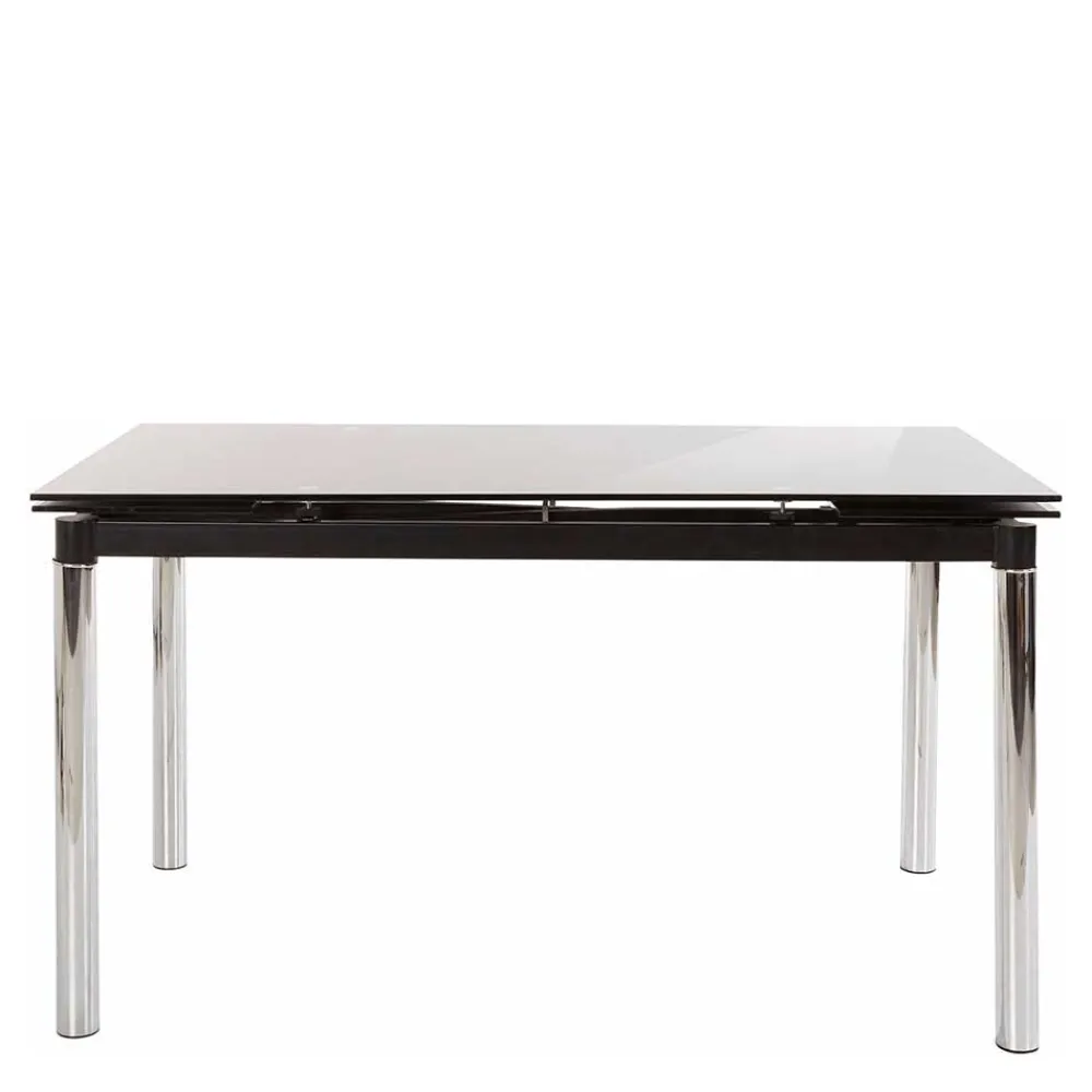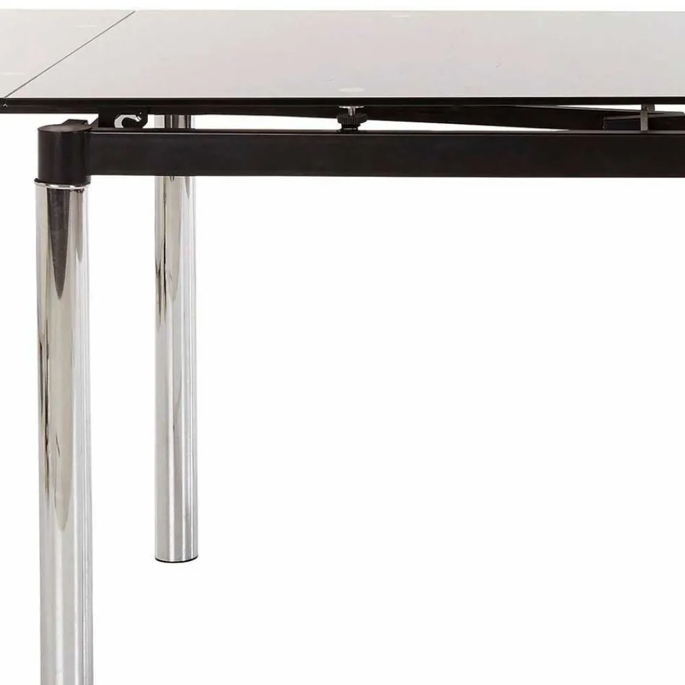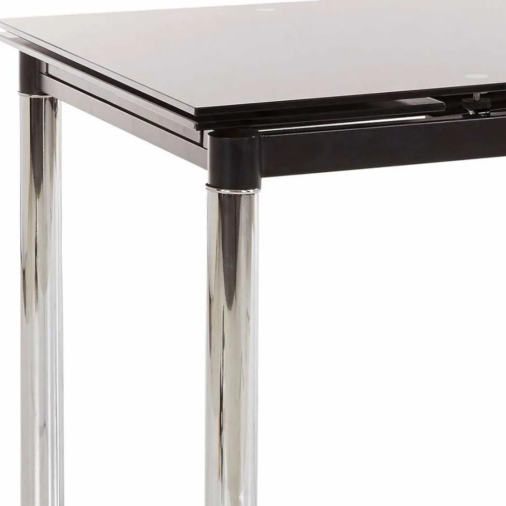 Der Ausziehtisch Tedyra ist zweifarbig in Schwarz und Chrom gestaltet. Er wird aus Sicherheitsglas und Metall gefertigt. – Die rechteckige Tischplatte besteht aus 1 cm starkem Glas, welches von unten in Schwarz lackiert ist. Die Tischzarge ist ebenfalls in Schwarz ausgeführt, während die vier runden Metallbeine des Tisches sich in glänzendem Chrom davon abheben.