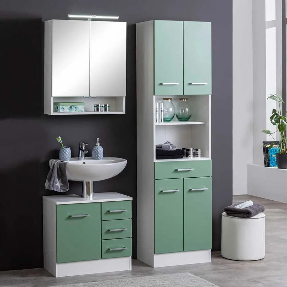 Mit dem Badezimmer-Set „Loenixa“ verwandelt sich jedes Bad in eine stilvolle und funktionale Wohlfühloase. Dieses Set besteht aus einem großzügigen Hochschrank, einem eleganten Spiegelschrank und einem praktischen Waschbeckenunterschrank. Die Kombination aus strahlendem Weiß und frischem Grün bringt Leben und Leichtigkeit in Ihr Badezimmer und vermittelt eine Atmosphäre, die jeden Morgen freundlich begrüßt. Das moderne Design mit klaren, geradlinigen Formen wirkt zeitgemäß und einladend. Die bewusst gesetzten Farbakzente lassen den Raum größer, heller und moderner erscheinen. Waschbecken ist bewusst nicht inklusive, um Ihnen die Freiheit zu lassen, Ihr bevorzugtes Modell auszuwählen und perfekt zu kombinieren.