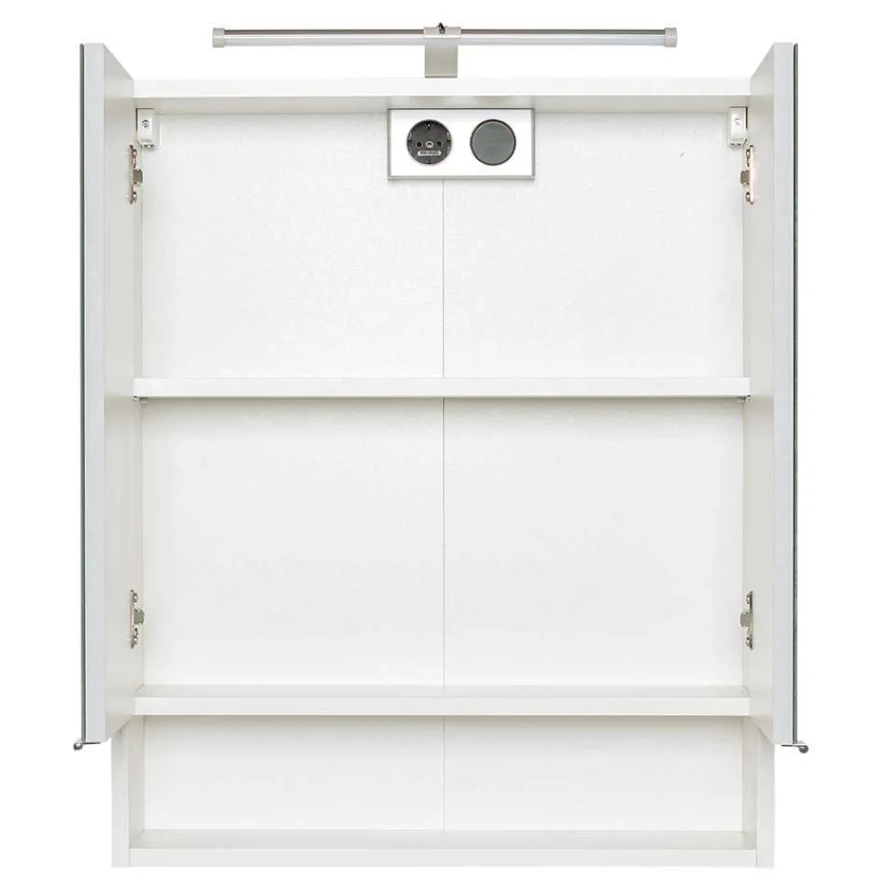- Innen befindet sich ein durchgehender Einlegeboden, oben mittig eine Steckdose und ein Lichtschalter