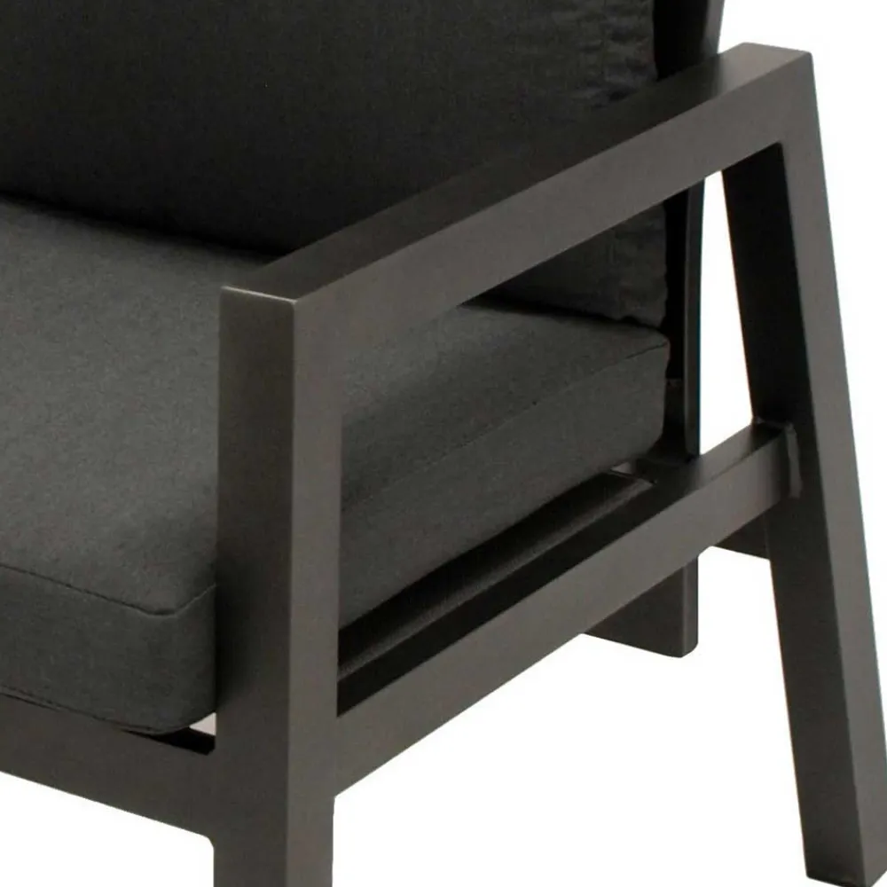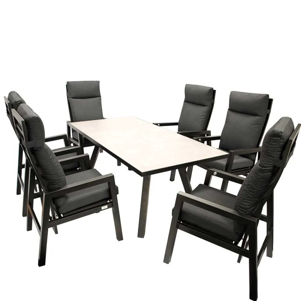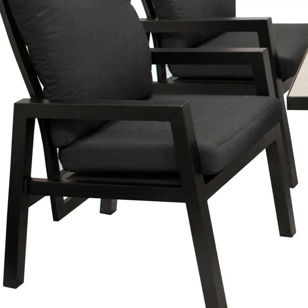 Das Design der Garten Sitzgruppe „Alpes“ verbindet klare Linien mit einer edlen Farbgebung in Dunkelgrau und Schwarz. Die Kombination aus filigranen Metallstrukturen, eleganten Stoffbezügen und einer stilvollen Glasplatte in Keramikoptik verleiht der Sitzgruppe eine moderne und zugleich zeitlose Ausstrahlung. Ob minimalistischer Stil oder moderne Gemütlichkeit – diese Sitzgruppe fügt sich perfekt in jede Umgebung ein und unterstreicht Ihre persönliche Note.