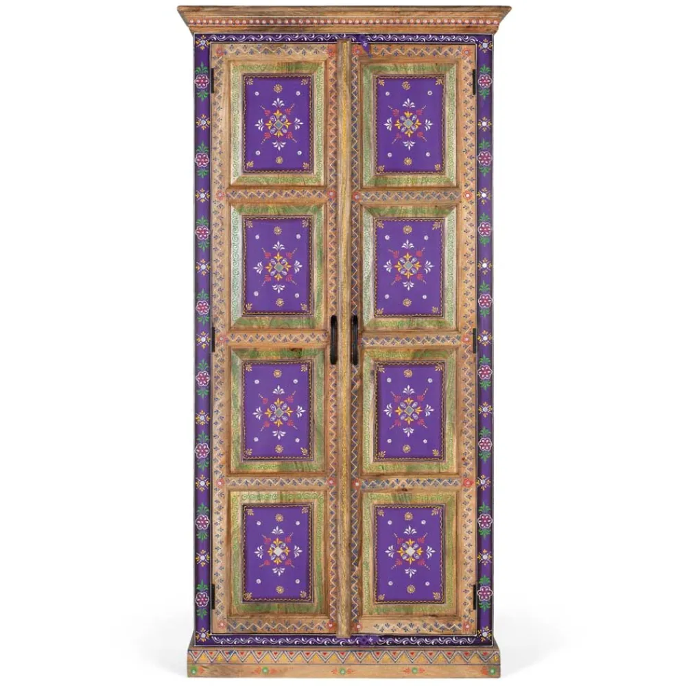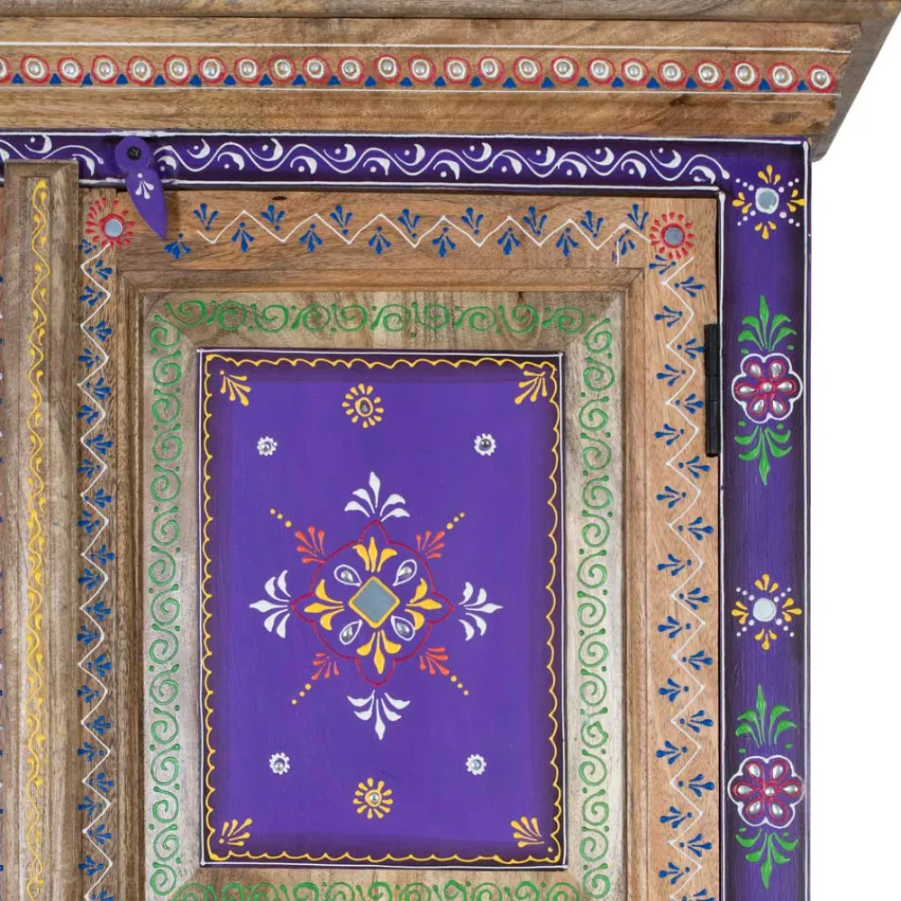 Besonders beeindruckend ist die kunstvolle Gestaltung der Oberflächen: Die handbemalten Ornamentmuster erzählen von fernöstlichen Märkten, geheimnisvollen Gassen und der Kunst jahrhundertealter Handwerkskunst. Jede Linie, jedes Motiv wird mit viel Liebe zum Detail aufgebracht und macht den Schrank zu einem authentischen Schmuckstück im orientalischen Stil. Die überstehende, gefräste Kranzleiste rundet das Design ab und verleiht dem Möbelstück eine elegante, traditionelle Silhouette.